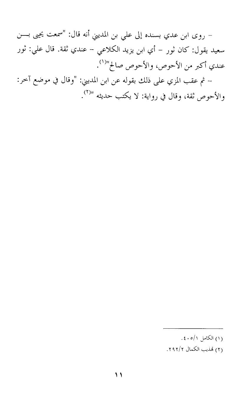 - روى ابن عدي بسنده إلى علي بن المديني أنه قال: "سمعت يحيى بن سعيد يقول: كان ثور - أي ابن يزيد الكلاعي - عندي ثقة. قال علي: ثور عندي أكبر من الأحوص، والأحوص صالح" (1) .