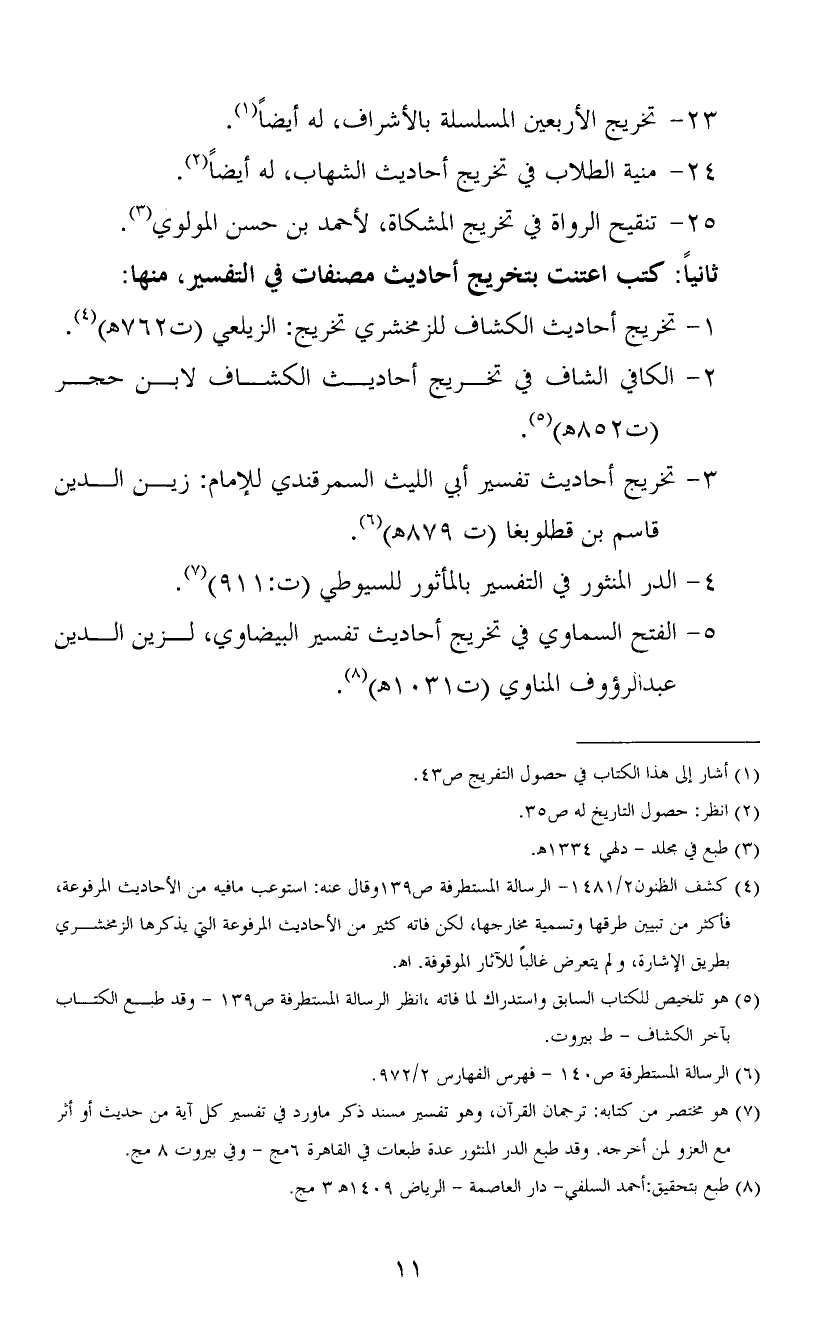 (4) كشف الظنون2/1481- الرسالة المستطرفة ص139وقال عنه: استوعب مافيه من الأحاديث المرفوعة، فأكثر من تبيين طرقها وتسمية مخارجها، لكن فاته كثير من الأحاديث المرفوعة التي يذكرها الزمخشري بطريق الإشارة، ولم يتعرض غالباً للآثار الموقوفة. ا?.