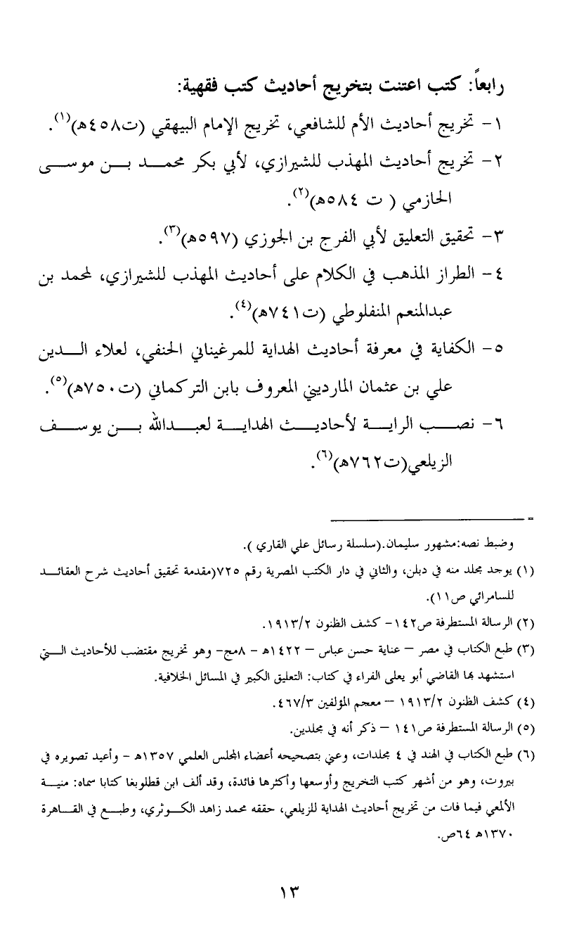 (6) طبع الكتاب في الهند في 4 مجلدات، وعني بتصحيحه أعضاء المجلس العلمي 1357? - وأعيد تصويره في بيروت، وهو من أشهر كتب التخريج وأوسعها وأكثرها فائدة، وقد ألف ابن قطلوبغا كتابا سماه: منية الألمعي فيما فات من تخريج أحاديث الهداية للزيلعي، حققه محمد زاهد الكوثري، وطبع في القاهرة 1370? 64ص.