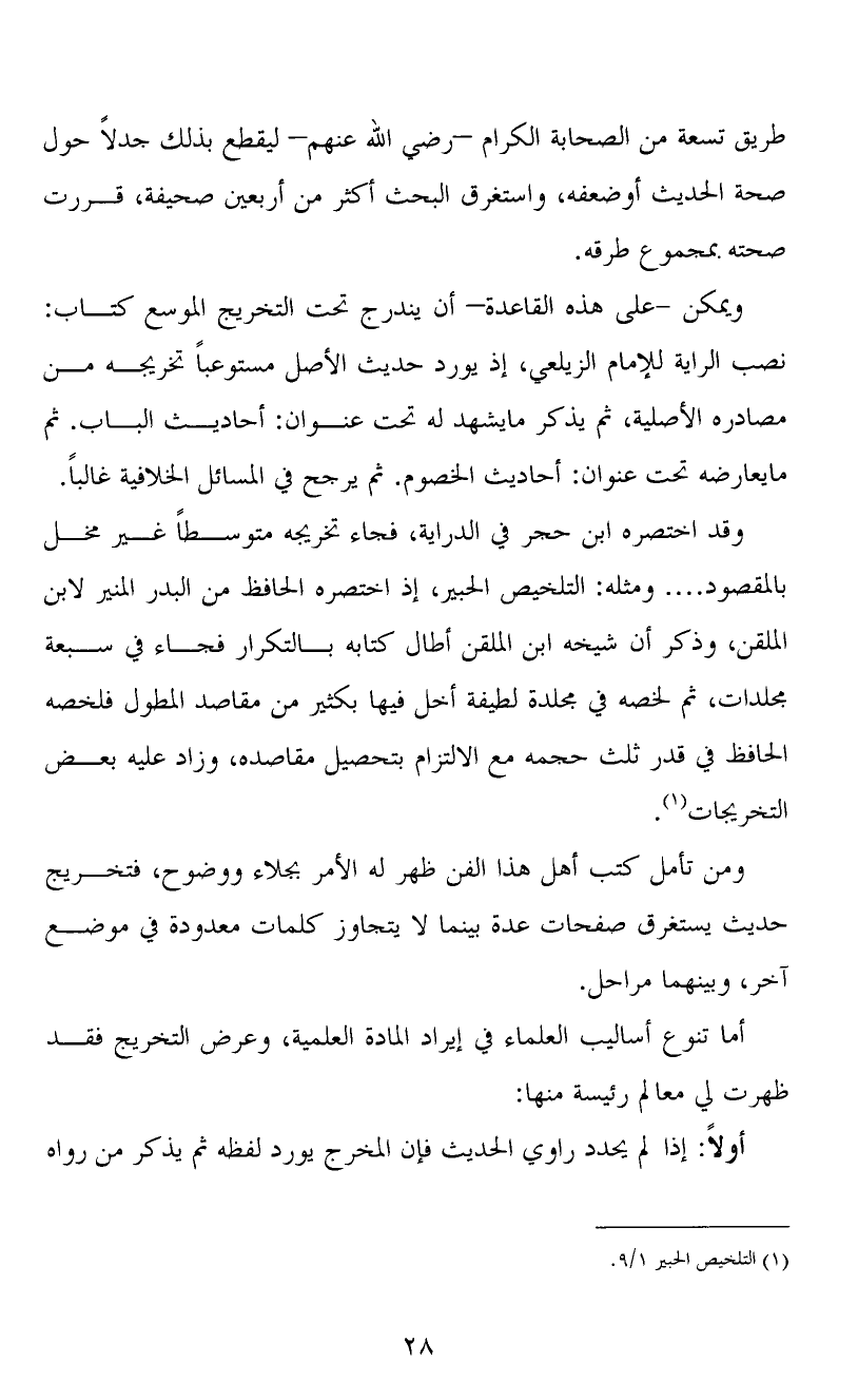 وقد اختصره ابن حجر في الدراية، فجاء تخريجه متوسطاً غير مخل بالمقصود.... ومثله: التلخيص الحبير، إذ اختصره الحافظ من البدر المنير لابن الملقن، وذكر أن شيخه ابن الملقن أطال كتابه بالتكرار فجاء في سبعة مجلدات، ثم لخصه في مجلدة لطيفة أخل فيها بكثير من مقاصد المطول فلخصه الحافظ في قدر ثلث حجمه مع الالتزام بتحصيل مقاصده، وزاد عليه بعض التخريجات (1) .