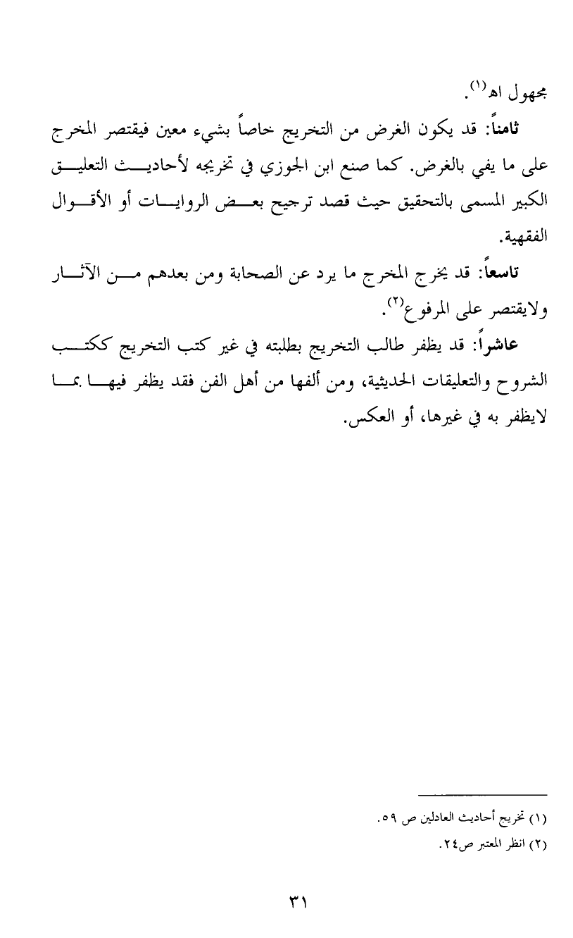 ثامناً: قد يكون الغرض من التخريج خاصاً بشيء معين فيقتصر المخرج على ما يفي بالغرض. كما صنع ابن الجوزي في تخريجه لأحاديث التعليق الكبير المسمى بالتحقيق حيث قصد ترجيح بعض الروايات أو الأقوال الفقهية.