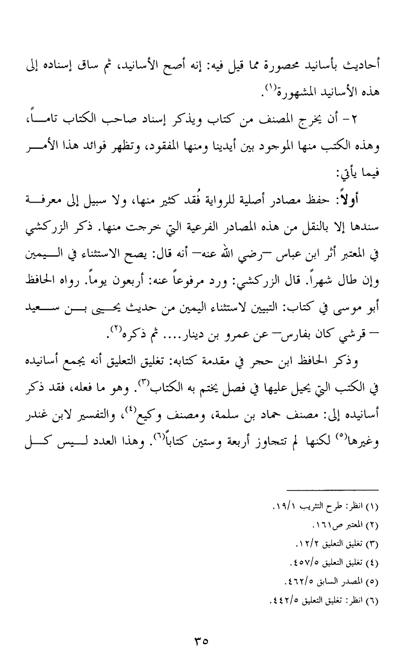 أولاً: حفظ مصادر أصلية للرواية فُقد كثير منها، ولا سبيل إلى معرفة سندها إلا بالنقل من هذه المصادر الفرعية التي خرجت منها. ذكر الزركشي في المعتبر أثر ابن عباس –رضي الله عنه– أنه قال: يصح الاستثناء في اليمين وإن طال شهراً. قال الزركشي: ورد مرفوعاً عنه: أربعون يوماً. رواه الحافظ أبو موسى في كتاب: التبيين لاستثناء اليمين من حديث يحيى بن سعيد