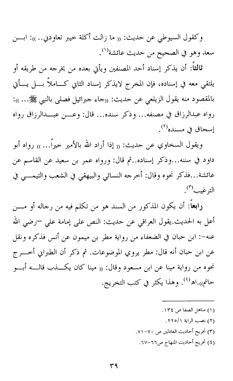 رابعاً: أن يكون المذكور من السند هو من تكلم فيه من رجاله أو من أعل به الحديث. يقول العراقي عن حديث: النص على إمامة علي –رضي الله عنه-: ابن حبان في الضعفاء من رواية مطر بن ميمون عن أنس فذكره ونقل عن ابن حبان أنه قال: مطر يروي الموضوعات. ثم ذكر أن الطبراني أخرج نحوه من رواية مينا عن ابن مسعود وقال: ((مينا كان يكذب قاله أبو حاتم)) .ا? (4) . وهذا يكثر في كتب التخريج.