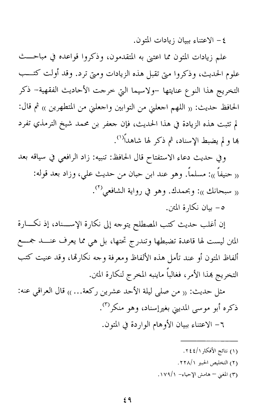 علم زيادات المتون مما اعتنى به المتقدمون، وذكروا قواعده في مباحث علوم الحديث، وذكروا متى تقبل هذه الزيادات ومتى ترد. وقد أولت كتب التخريج هذا النوع عنايتها -ولاسيما التي خرجت الأحاديث الفقهية- ذكر الحافظ حديث: "اللهم اجعلني من التوابين واجعلني من المتطهرين" ثم قال: لم تثبت هذه الزيادة في هذا الحديث، فإن جعفر بن محمد شيخ الترمذي تفرد بها ولم يضبط الإسناد، ثم ذكر لها شاهداً (1) .