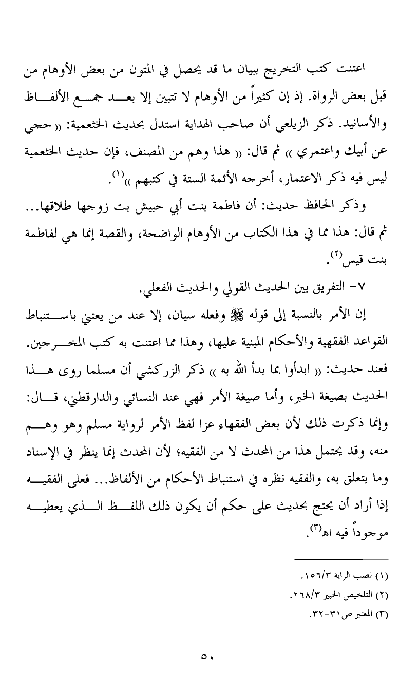إن الأمر بالنسبة إلى قوله صلى الله عليه وسلم وفعله سيان، إلا عند من يعتني باستنباط القواعد الفقهية والأحكام المبنية عليها، وهذا مما اعتنت به كتب المخرجين. فعند حديث: "ابدأوا بما بدأ الله به" ذكر الزركشي أن مسلما روى هذا الحديث بصيغة الخبر، وأما صيغة الأمر فهي عند النسائي والدارقطني، قال: وإنما ذكرت ذلك لأن بعض الفقهاء عزا لفظ الأمر لرواية مسلم وهو وهم منه، وقد يحتمل هذا من المحدث لا من الفقيه؛ لأن المحدث إنما ينظر في الإسناد وما يتعلق به، والفقيه نظره في استنباط الأحكام من الألفاظ ... فعلى الفقيه إذا أراد أن يحتج بحديث على حكم أن يكون ذلك اللفظ الذي يعطيه موجوداً فيه ا? (3) .