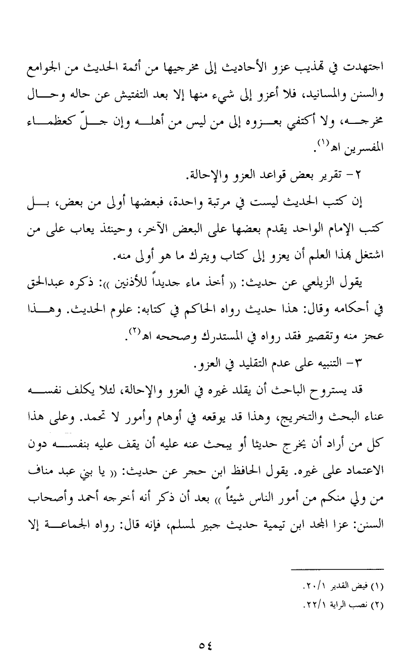 قد يستروح الباحث أن يقلد غيره في العزو والإحالة، لئلا يكلف نفسه عناء البحث والتخريج، وهذا قد يوقعه في أوهام وأمور لا تحمد. وعلى هذا كل من أراد أن يخرج حديثا أو يبحث عنه عليه أن يقف عليه بنفسه دون الاعتماد على غيره. يقول الحافظ ابن حجر عن حديث: "يا بني عبد مناف من ولي منكم من أمور الناس شيئاً" بعد أن ذكر أنه أخرجه أحمد وأصحاب السنن: عزا المجد ابن تيمية حديث جبير لمسلم، فإنه قال: رواه الجماعة إلا