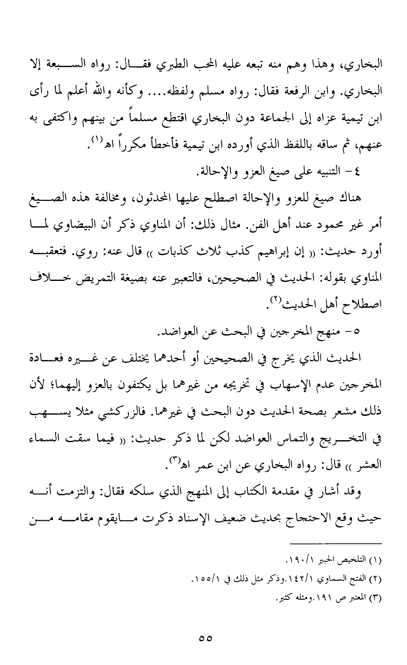 هناك صيغ للعزو والإحالة اصطلح عليها المحدثون، ومخالفة هذه الصيغ أمر غير محمود عند أهل الفن. مثال ذلك: أن المناوي ذكر أن البيضاوي لما أورد حديث: "إن إبراهيم كذب ثلاث كذبات" قال عنه: روي. فتعقبه المناوي بقوله: الحديث في الصحيحين، فالتعبير عنه بصيغة التمريض خلاف اصطلاح أهل الحديث (2) .