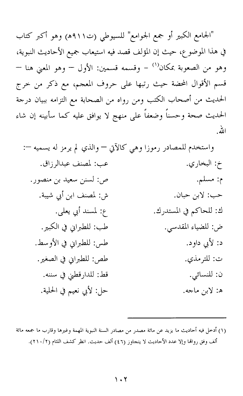 "الجامع الكبير أو جمع الجوامع" للسيوطي (ت911هـ) وهو أكبر كتاب في هذا الموضوع، حيث إن المؤلف قصد فيه استيعاب جميع الأحاديث النبوية، وهو من الصعوبة بمكان (1) - وقسمه قسمين: الأول – وهو المعني هنا – قسم الأقوال المحضة حيث رتبها على حروف المعجم، مع ذكر من خرج الحديث من أصحاب الكتب ومن رواه من الصحابة مع التزامه ببيان درجة الحديث صحة وحسناً وضعفاً على منهج لا يوافق عليه كما سأبينه إن شاء الله.