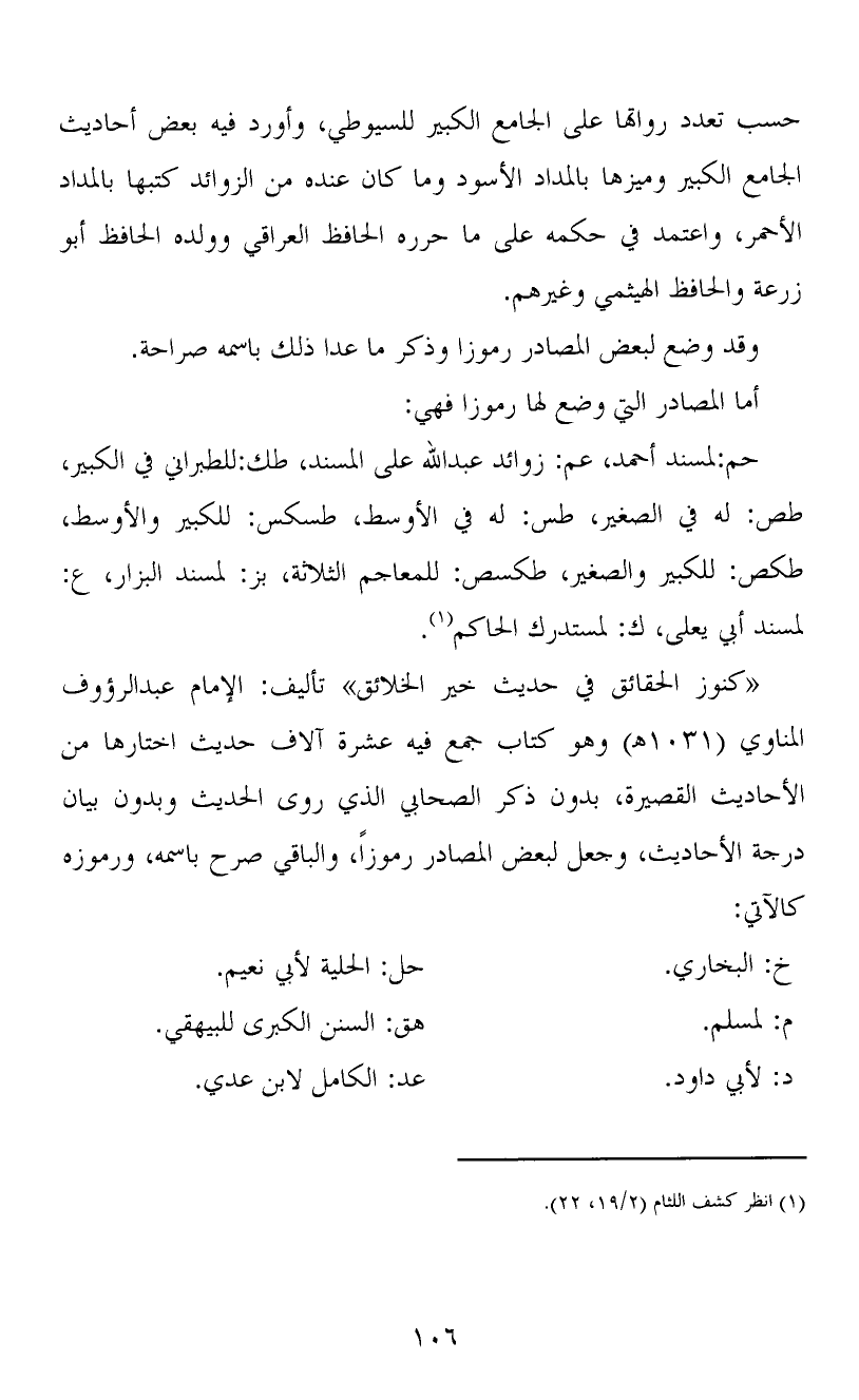 «كنوز الحقائق في حديث خير الخلائق» تأليف: الإمام عبد الرؤوف المناوي (1031هـ) وهو كتاب جمع فيه عشرة آلاف حديث اختارها من الأحاديث القصيرة، بدون ذكر الصحابي الذي روى الحديث وبدون بيان درجة الأحاديث، وجعل لبعض المصادر رموزاً، والباقي صرح باسمه، ورموزه كالآتي: