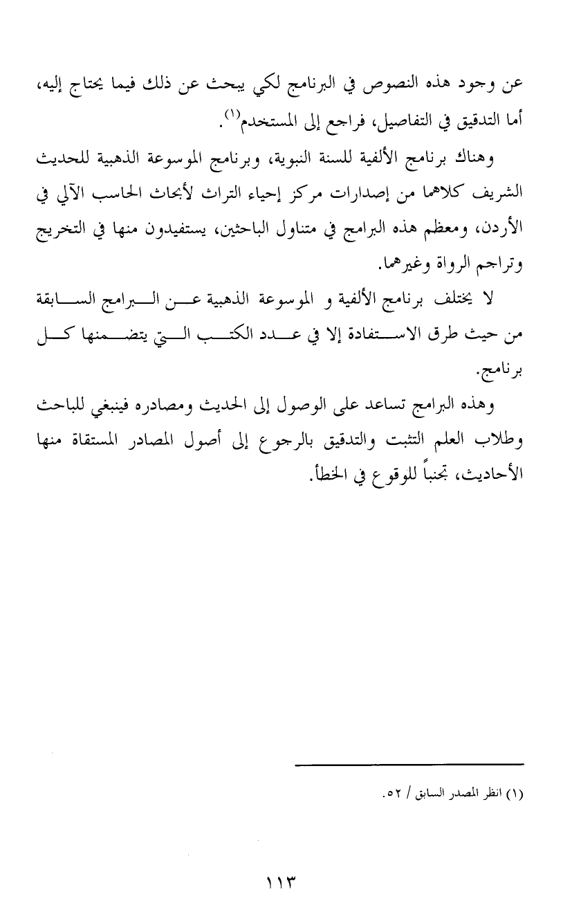 وهذه البرامج تساعد على الوصول إلى الحديث ومصادره فينبغي للباحث وطلاب العلم التثبت والتدقيق بالرجوع إلى أصول المصادر المستقاة منها الأحاديث، تجنباً للوقوع في الخطأ.