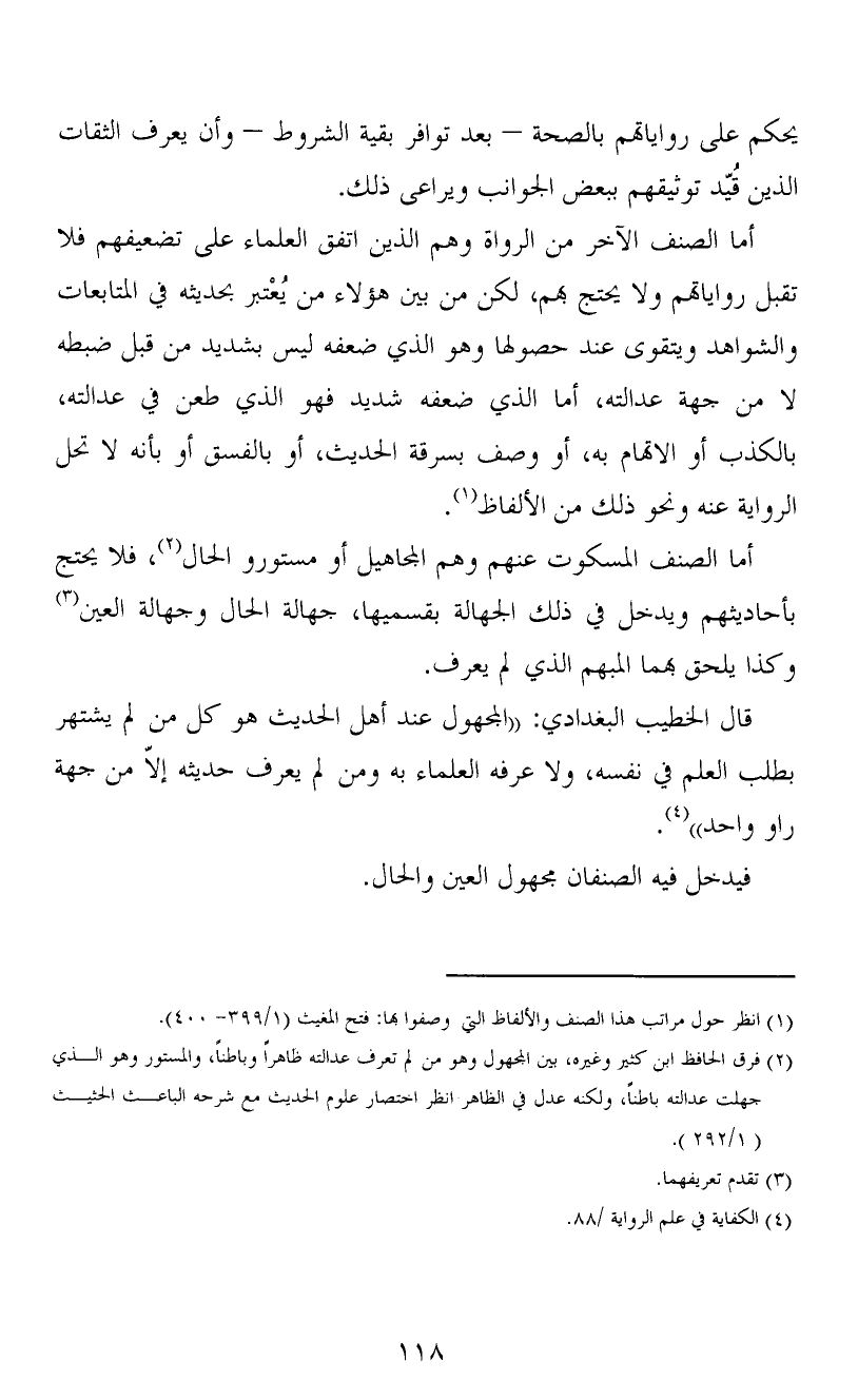 (2) فرق الحافظ ابن كثير وغيره، بين المجهول وهو من لم تعرف عدالته ظاهراً وباطناً، والمستور وهو الذي جهلت عدالته باطناً، ولكنه عدل في الظاهر انظر اختصار علوم الحديث مع شرحه الباعث الحثيث