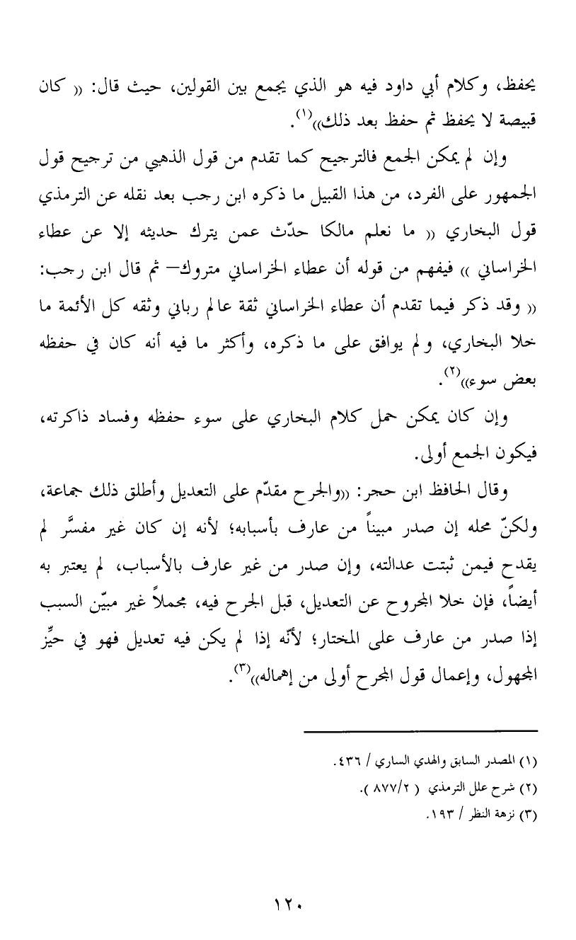 وإن لم يمكن الجمع فالترجيح كما تقدم من قول الذهبي من ترجيح قول الجمهور على الفرد، من هذا القبيل ما ذكره ابن رجب بعد نقله عن الترمذي قول البخاري ((ما نعلم مالكا حدّث عمن يترك حديثه إلا عن عطاء الخراساني)) فيفهم من قوله أن عطاء الخراساني متروك– ثم قال ابن رجب: