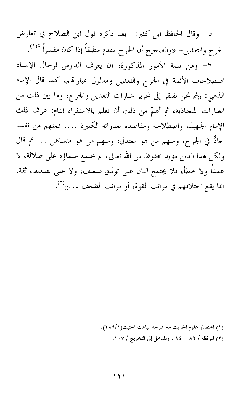 5- وقال الحافظ ابن كثير: -بعد ذكره قول ابن الصلاح في تعارض الجرح والتعديل- «والصحيح أن الجرح مقدم مطلقاً إذا كان مفسراً» (1) .
