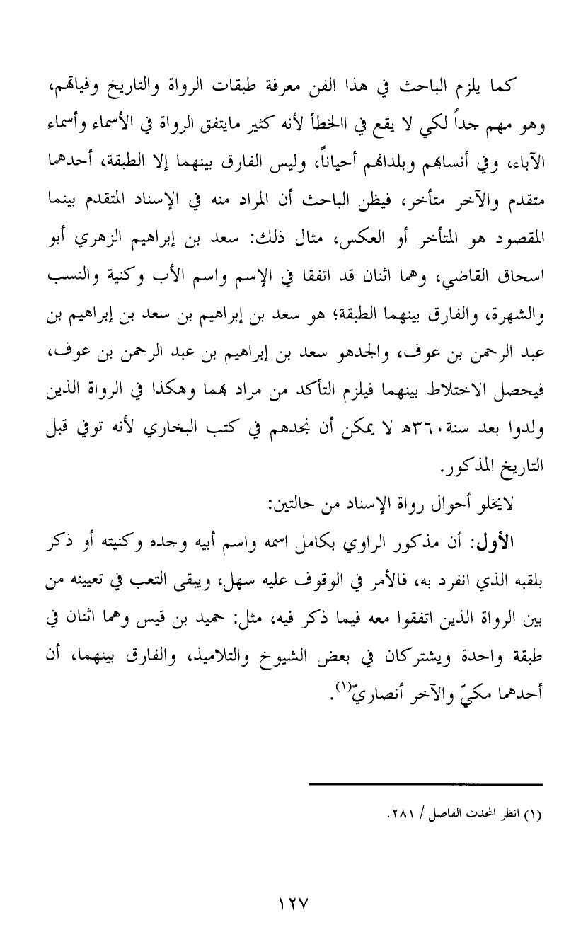 الأول: أن مذكور الراوي بكامل اسمه واسم أبيه وجده وكنيته أو ذكر بلقبه الذي انفرد به، فالأمر في الوقوف عليه سهل، ويبقى التعب في تعيينه من بين الرواة الذين اتفقوا معه فيما ذكر فيه، مثل: حميد بن قيس وهما اثنان في طبقة واحدة ويشتركان في بعض الشيوخ والتلاميذ، والفارق بينهما، أن أحدهما مكيّ والآخر أنصاريّ (1) .