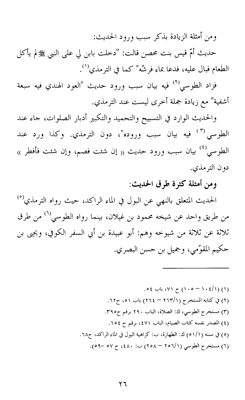 الحديث المتعلق بالنهي عن البول في الماء الراكد، حيث رواه الترمذي (5) من طريق واحد عن شيخه محمود بن غيلان، بينما رواه الطوسي (6) من طرق ثلاثة عن ثلاثة من شيوخه وهم: أبو عبيدة بن أبي السفر الكوفي، ويحيى بن حكيم المقوّمي، وجميل بن حسن البصري.