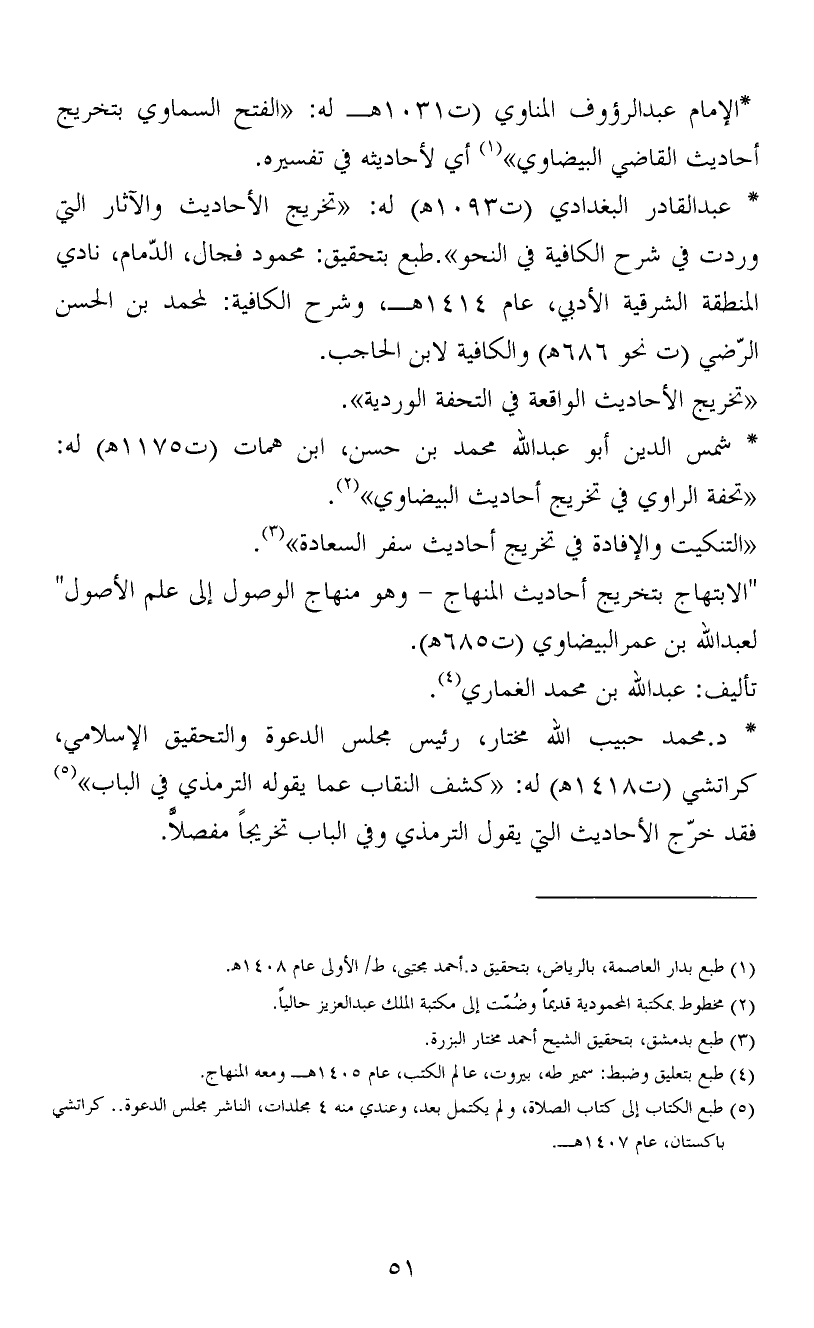 * عبد القادر البغدادي (ت1093هـ) له: «تخريج الأحاديث والآثار التي وردت في شرح الكافية في النحو» .طبع بتحقيق: محمود فجال، الدّمام، نادي المنطقة الشرقية الأدبي، عام 1414هـ، وشرح الكافية: لمحمد بن الحسن الرّضي (ت نحو 686هـ) والكافية لابن الحاجب.