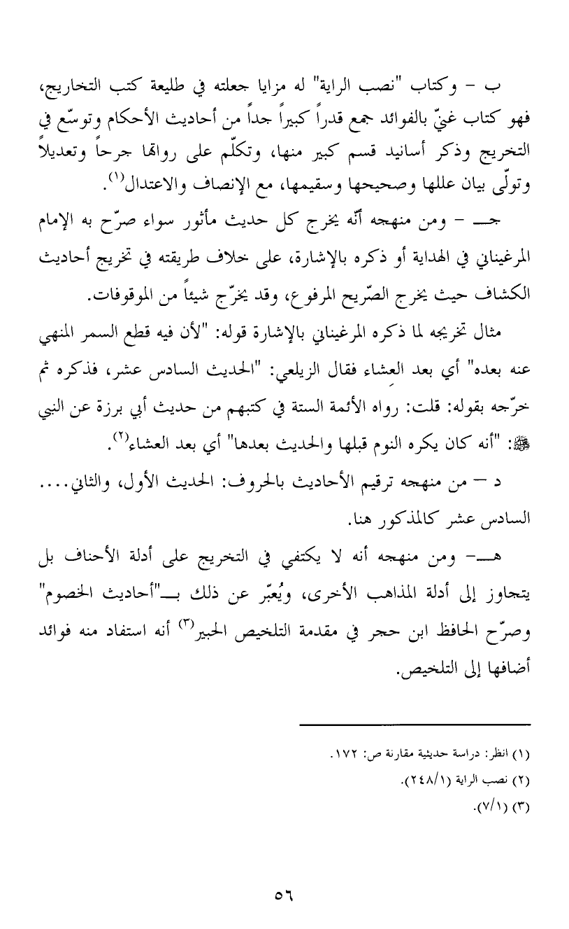 ب - وكتاب "نصب الراية" له مزايا جعلته في طليعة كتب التخاريج، فهو كتاب غنيّ بالفوائد جمع قدراً كبيراً جداً من أحاديث الأحكام وتوسّع في التخريج وذكر أسانيد قسم كبير منها، وتكلّم على رواتها جرحاً وتعديلاً وتولّى بيان عللها وصحيحها وسقيمها، مع الإنصاف والاعتدال (1) .