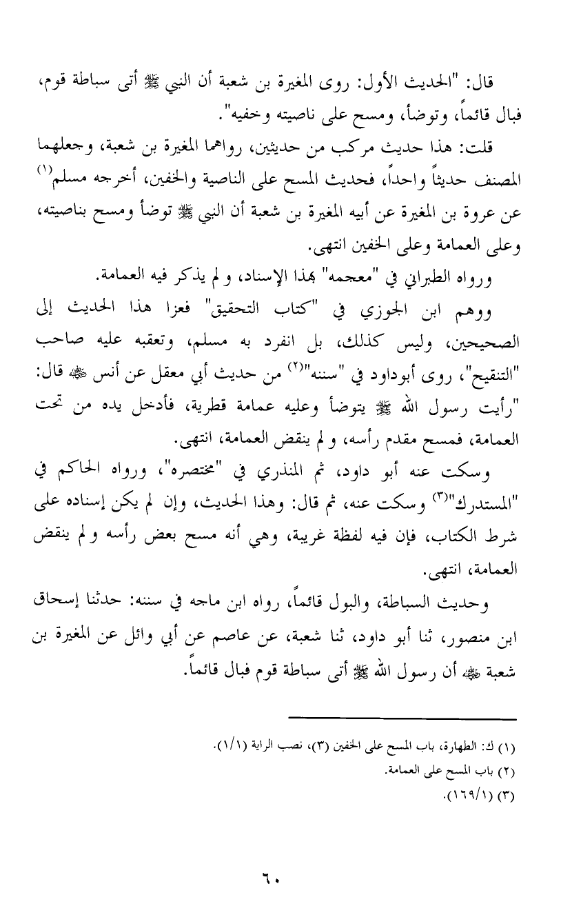 قال: "الحديث الأول: روى المغيرة بن شعبة أن النبي صلى الله عليه وسلم أتى سباطة قوم، فبال قائماً، وتوضأ، ومسح على ناصيته وخفيه".