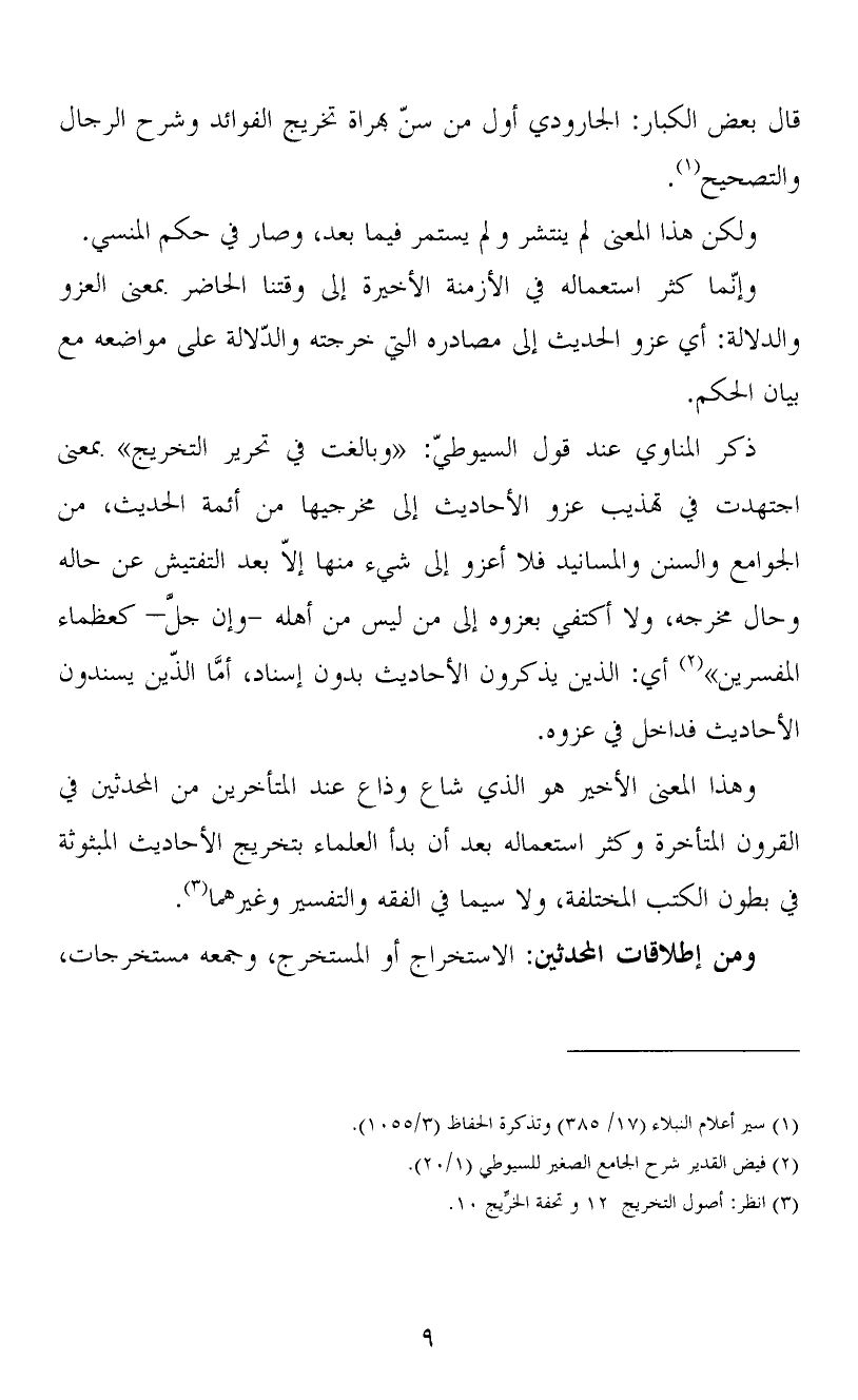 ذكر المناوي عند قول السيوطيّ: «وبالغت في تحرير التخريج» بمعنى اجتهدت في تهذيب عزو الأحاديث إلى مخرجيها من أئمة الحديث، من الجوامع والسنن والمسانيد فلا أعزو إلى شيء منها إلاّ بعد التفتيش عن حاله وحال مخرجه، ولا أكتفي بعزوه إلى من ليس من أهله -وإن جلَّ– كعظماء المفسرين» (2) أي: الذين يذكرون الأحاديث بدون إسناد، أمَّا الذّين يسندون الأحاديث فداخل في عزوه.