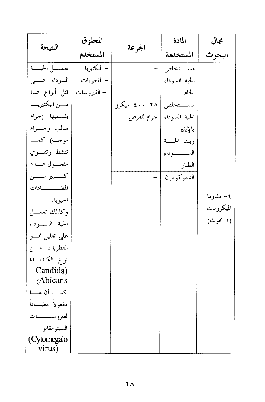 وكذلك تعمل الحبة السوداء على تقليل نمو الفطريات من نوع الكنديدا Candida) Abicans) كما أن لها مفعولاً مضاداً لفيروسات السيتومقالو