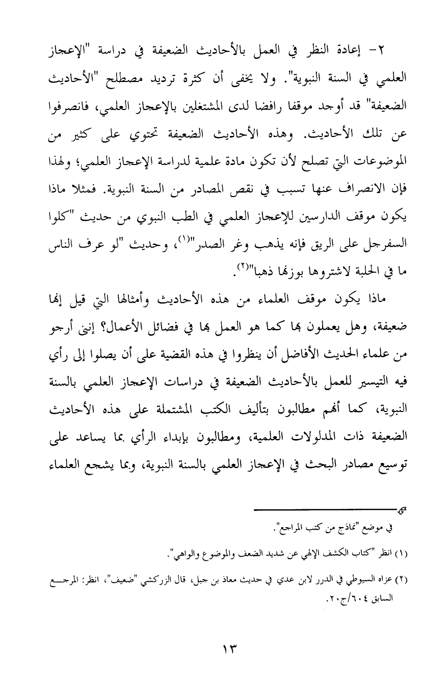 2- إعادة النظر في العمل بالأحاديث الضعيفة في دراسة "الإعجاز العلمي في السنة النبوية". ولا يخفى أن كثرة ترديد مصطلح "الأحاديث الضعيفة" قد أوجد موقفا رافضا لدى المشتغلين بالإعجاز العلمي، فانصرفوا عن تلك الأحاديث. وهذه الأحاديث الضعيفة تحتوي على كثير من الموضوعات التي تصلح لأن تكون مادة علمية لدراسة الإعجاز العلمي؛ ولهذا فإن الانصراف عنها تسبب في نقص المصادر من السنة النبوية. فمثلا ماذا يكون موقف الدارسين للإعجاز العلمي في الطب النبوي من حديث "كلوا السفرجل على الريق فإنه يذهب وغر الصدر" (1) ، وحديث "لو عرف الناس ما في الحلبة لاشتروها بوزنها ذهبا" (2) .