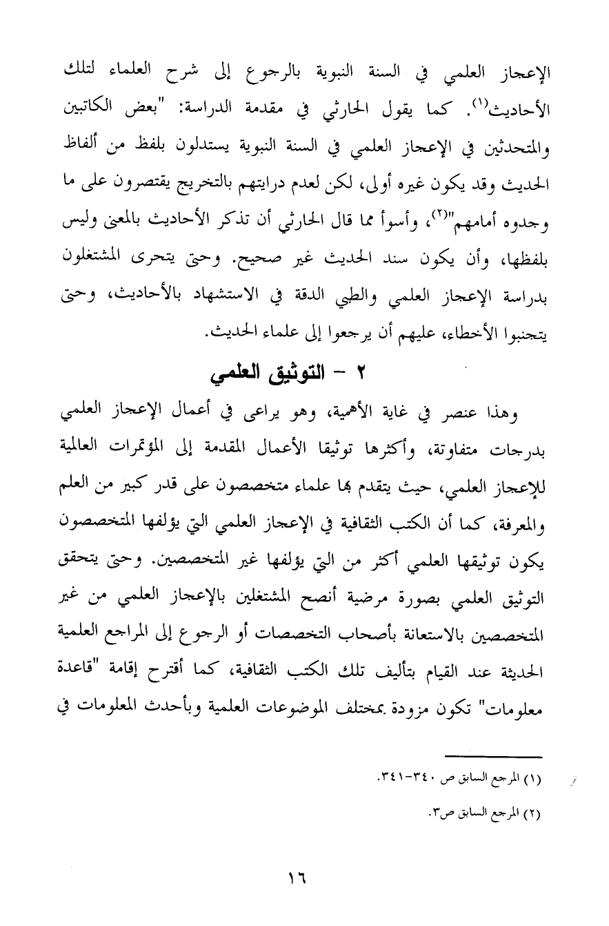 الإعجاز العلمي في السنة النبوية بالرجوع إلى شرح العلماء لتلك الأحاديث (1) . كما يقول الحارثي في مقدمة الدراسة: "بعض الكاتبين والمتحدثين في الإعجاز العلمي في السنة النبوية يستدلون بلفظ من ألفاظ الحديث وقد يكون غيره أولى، لكن لعدم درايتهم بالتخريج يقتصرون على ما وجدوه أمامهم" (2) ، وأسوأ مما قال الحارثي أن تذكر الأحاديث بالمعنى وليس بلفظها، وأن يكون سند الحديث غير صحيح. وحتى يتحرى المشتغلون بدراسة الإعجاز العلمي والطبي الدقة في الاستشهاد بالأحاديث، وحتى يتجنبوا الأخطاء، عليهم أن يرجعوا إلى علماء الحديث.