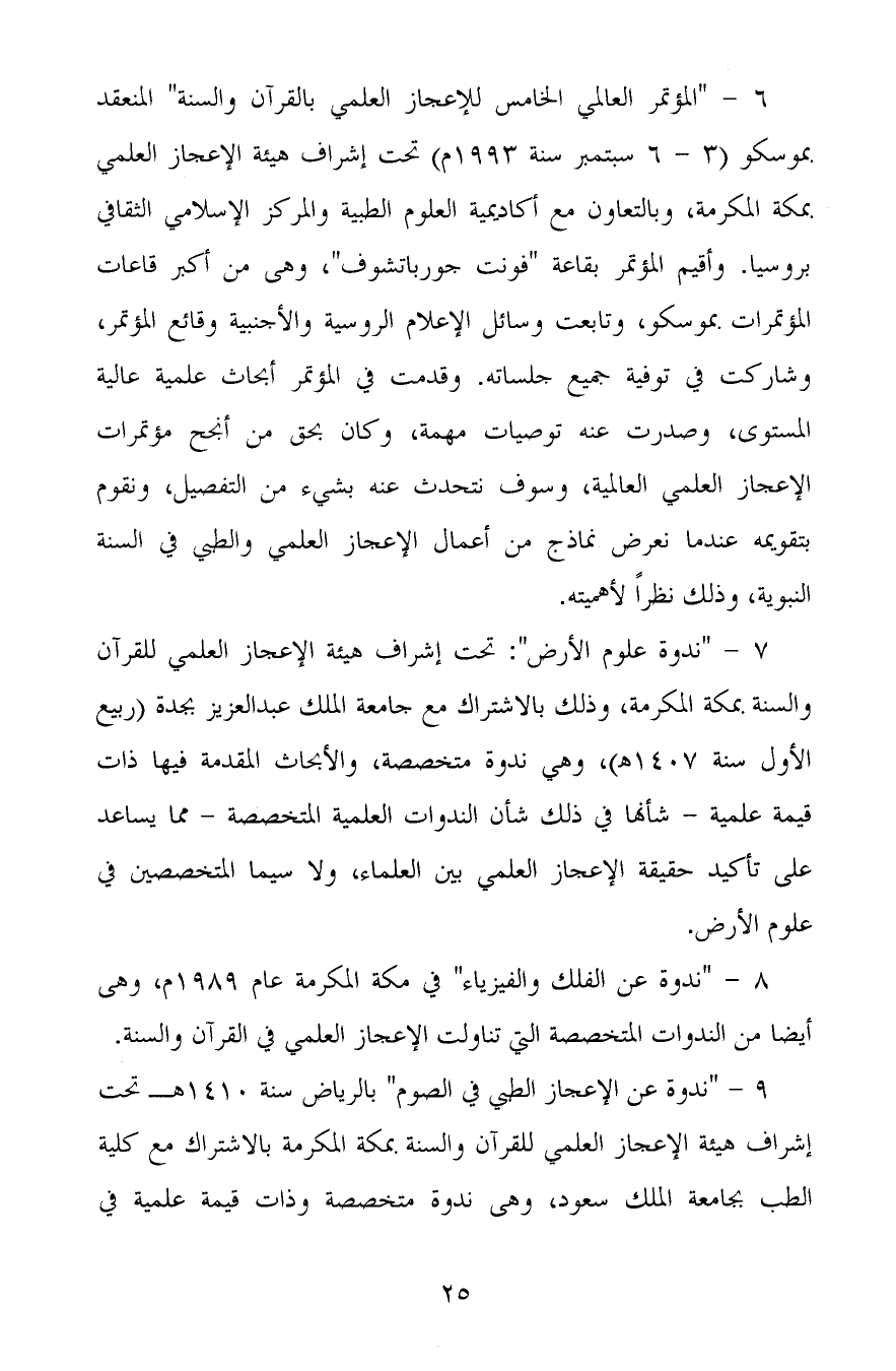 6 - "المؤتمر العالمي الخامس للإعجاز العلمي بالقرآن والسنة" المنعقد بموسكو (3 - 6 سبتمبر سنة 1993م) تحت إشراف هيئة الإعجاز العلمي بمكة المكرمة، وبالتعاون مع أكاديمية العلوم الطبية والمركز الإسلامي الثقافي بروسيا. وأقيم المؤتمر بقاعة "فونت جورباتشوف"، وهى من أكبر قاعات المؤتمرات بموسكو، وتابعت وسائل الإعلام الروسية والأجنبية وقائع المؤتمر، وشاركت في توفية جميع جلساته. وقدمت في المؤتمر أبحاث علمية عالية المستوى، وصدرت عنه توصيات مهمة، وكان بحق من أنجح مؤتمرات الإعجاز العلمي العالمية، وسوف نتحدث عنه بشيء من التفصيل، ونقوم بتقويمه عندما نعرض نماذج من أعمال الإعجاز العلمي والطبي في السنة النبوية، وذلك نظراً لأهميته.