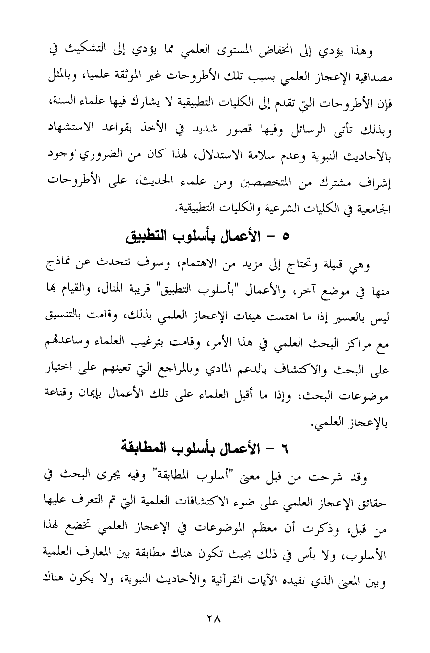 وهذا يؤدي إلى انخفاض المستوى العلمي مما يؤدي إلى التشكيك في مصداقية الإعجاز العلمي بسبب تلك الأطروحات غير الموثقة علميا، وبالمثل فإن الأطروحات التي تقدم إلى الكليات التطبيقية لا يشارك فيها علماء السنة، وبذلك تأتى الرسائل وفيها قصور شديد في الأخذ بقواعد الاستشهاد بالأحاديث النبوية وعدم سلامة الاستدلال، لهذا كان من الضروري وجود إشراف مشترك من المتخصصين ومن علماء الحديث، على الأطروحات الجامعية في الكليات الشرعية والكليات التطبيقية.