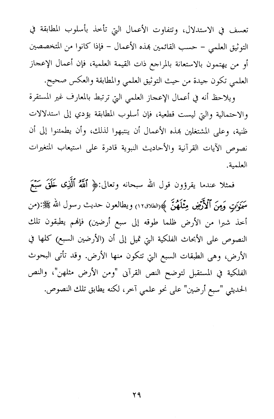 فمثلا عندما يقرؤون قول الله سبحانه وتعالى: {اللَّهُ الَّذِي خَلَقَ سَبْعَ سَمَاوَاتٍ وَمِنَ الأَرْضِ مِثْلَهُنَّ} (الطلاق12) ويطالعون حديث رسول الله صلى الله عليه وسلم: "من أخذ شبرا من الأرض ظلما طوقه إلى سبع أرضين" فإنهم يطبقون تلك النصوص على الأبحاث الفلكية التي تميل إلى أن (الأرضين السبع) كلها في الأرض، وهى الطبقات السبع التي تتكون منها الأرض. وقد تأتى البحوث الفلكية في المستقبل لتوضح النص القرآنى "ومن الأرض مثلهن"، والنص الحديثي "سبع أرضين" على نحو علمي آخر، لكنه يطابق تلك النصوص.