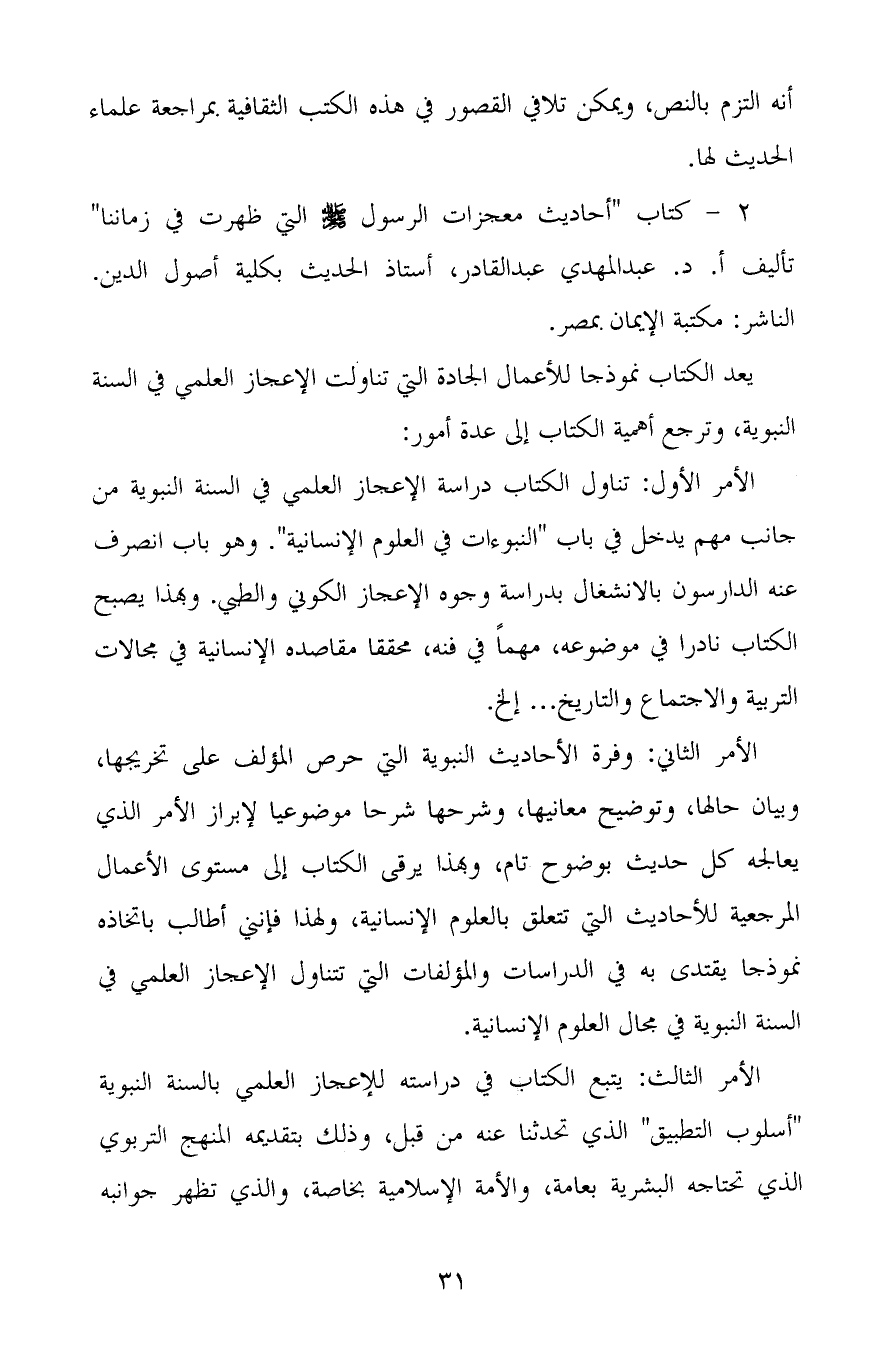 2 - كتاب "أحاديث معجزات الرسول صلى الله عليه وسلم التي ظهرت في زماننا" تأليف أ. د. عبد المهدي عبد القادر، أستاذ الحديث بكلية أصول الدين. الناشر: مكتبة الإيمان بمصر.