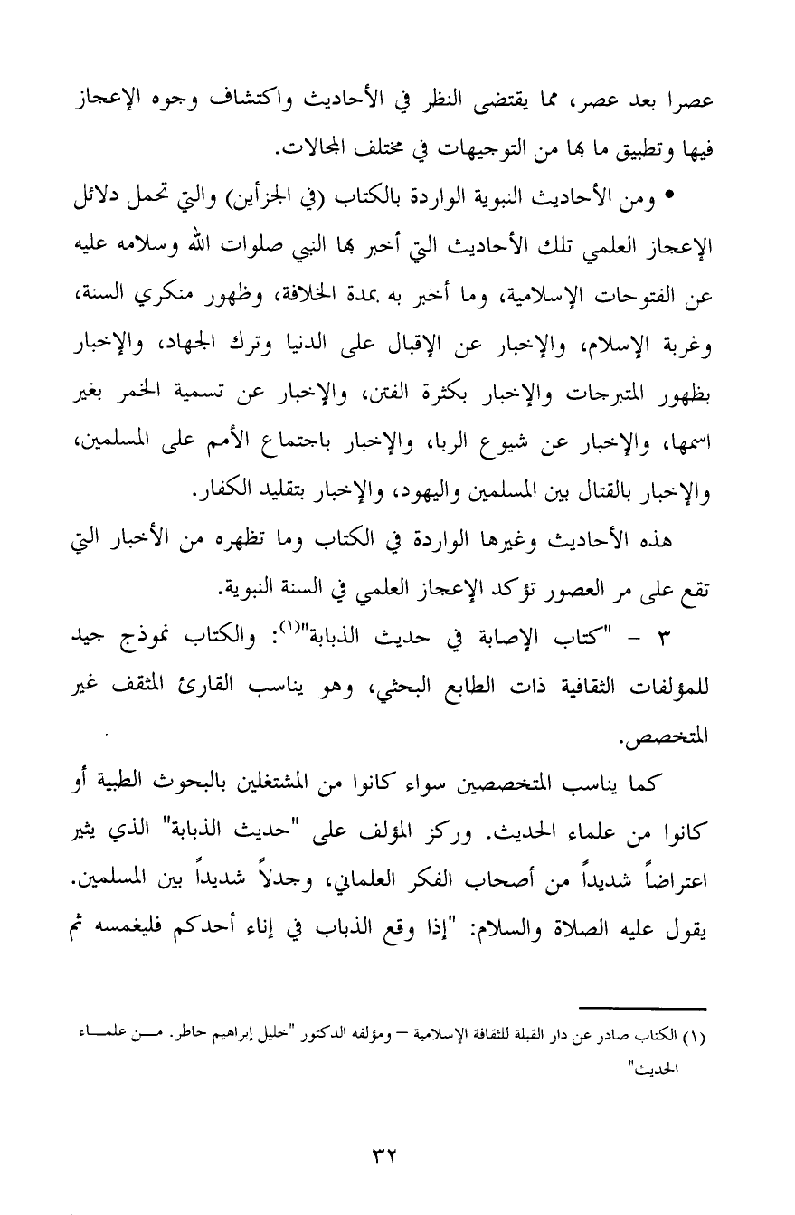 3 - "كتاب الإصابة في حديث الذبابة" (1) : والكتاب نموذج جيد للمؤلفات الثقافية ذات الطابع البحثي، وهو يناسب القارئ المثقف غير المتخصص.