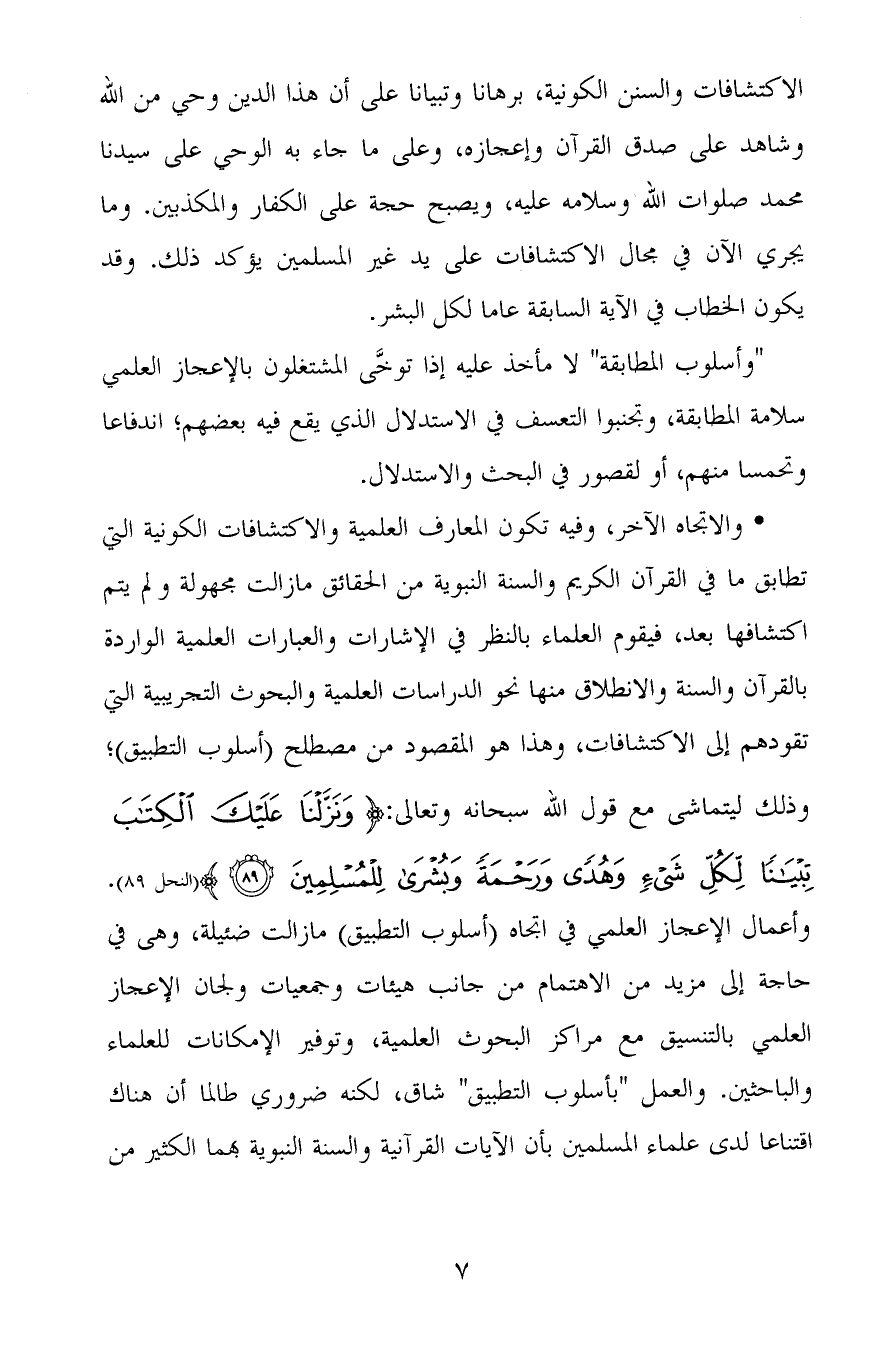 · والاتجاه الآخر، وفيه تكون المعارف العلمية والاكتشافات الكونية التي تطابق ما في القرآن الكريم والسنة النبوية من الحقائق مازالت مجهولة ولم يتم اكتشافها بعد، فيقوم العلماء بالنظر في الإشارات والعبارات العلمية الواردة بالقرآن والسنة والانطلاق منها نحو الدراسات العلمية والبحوث التجريبية التي تقودهم إلى الاكتشافات، وهذا هو المقصود من مصطلح (أسلوب التطبيق) ؛ وذلك ليتماشى مع قول الله سبحانه وتعالى: {وَنَزَّلْنَا عَلَيْكَ الْكِتَابَ تِبْيَاناً لِكُلِّ شَيْءٍ وَهُدىً وَرَحْمَةً وَبُشْرَى لِلْمُسْلِمِينَ} (النحل 89) . وأعمال الإعجاز العلمي في اتجاه (أسلوب التطبيق) مازالت ضئيلة، وهى في حاجة إلى مزيد من الاهتمام من جانب هيئات وجمعيات ولجان الإعجاز العلمي بالتنسيق مع مراكز البحوث العلمية، وتوفير الإمكانات للعلماء والباحثين. والعمل "بأسلوب التطبيق" شاق، لكنه ضروري طالما أن هناك اقتناعا لدى علماء المسلمين بأن الآيات القرآنية والسنة النبوية بهما الكثير من