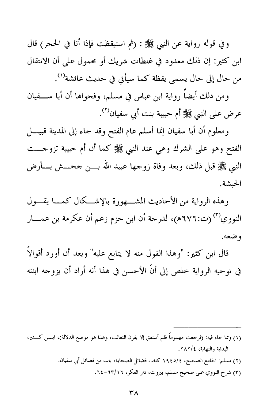 ومن ذلك أيضاً رواية ابن عباس في مسلم، وفحواها أن أبا سفيان عرض على النبي صلى الله عليه وسلم أم حبيبة بنت أبي سفيان (2) .