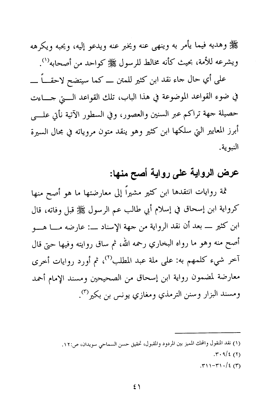 ثمة روايات انتقدها ابن كثير مشيراً إلى معارضتها ما هو أصح منها كرواية ابن إسحاق في إسلام أبي طالب عم الرسول صلى الله عليه وسلم قبل وفاته، قال ابن كثير ـ بعد أن نقد الرواية من جهة الإسناد ـ: عارضه ما هو أصح منه وهو ما رواه البخاري رحمه الله، ثم ساق روايته وفيها حتى قال آخر شيء كلمهم به: على ملة عبد المطلب (2) ، ثم أورد روايات أخرى معارضة لمضمون رواية ابن إسحاق من الصحيحين ومسند الإمام أحمد ومسند البزار وسنن الترمذي ومغازي يونس بن بكير (3) .