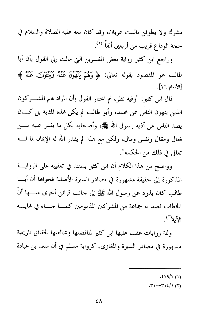 وواضح من هذا الكلام أن ابن كثير يستند في تعقيبه على الرواية المذكورة إلى حقيقة مشهورة في مصادر السيرة الأصلية فحواها أن أبا طالب كان يذود عن رسول الله صلى الله عليه وسلم إلى جانب قرائن أخرى منها أنَّ الخطاب قصد به جماعة من المشركين المذمومين كما جاء في نهاية الآية (2) .