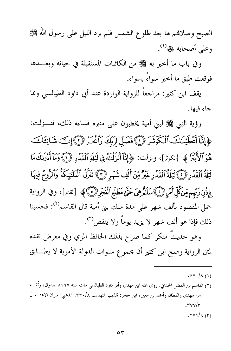 {إِنَّا أَعْطَيْنَاكَ الْكَوْثَرَ فَصَلِّ لِرَبِّكَ وَانْحَرْ إِنَّ شَانِئَكَ هُوَ الأَبْتَرُ} [الكوثر] ، ونزلت: {إِنَّا أَنزَلْنَاهُ فِي لَيْلَةِ الْقَدْرِ، وَمَا أَدْرَاكَ مَا لَيْلَةُ الْقَدْرِ، لَيْلَةُ الْقَدْرِ خَيْرٌ مِّنْ أَلْفِ شَهْرٍ، تَنَزَّلُ الْمَلَائِكَةُ وَالرُّوحُ فِيهَا بِإِذْنِ رَبِّهِم مِّن كُلِّ أَمْرٍ، سَلَامٌ هِيَ حَتَّى مَطْلَعِ الْفَجْرِ} [القدر] ، وفي الرواية حمل المقصود بألف شهر على مدة ملك بني أمية قال القاسم (2) : فحسبنا ذلك فإذا هو ألف شهر لا يزيد يوماً ولا ينقص (3) .