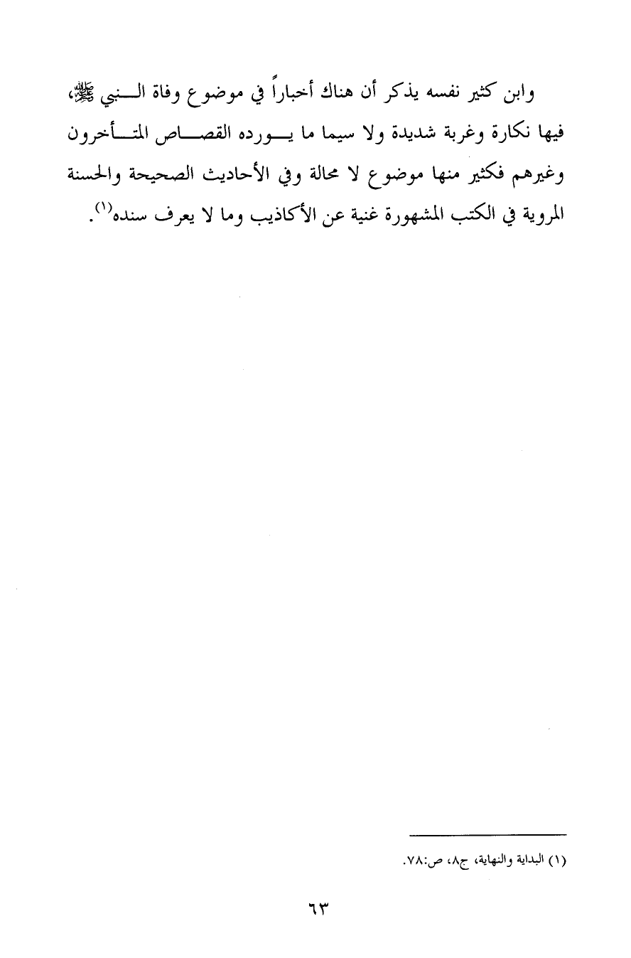 وابن كثير نفسه يذكر أن هناك أخباراً في موضوع وفاة النبي صلى الله عليه وسلم، فيها نكارة وغربة شديدة ولا سيما ما يورده القصاص المتأخرون وغيرهم فكثير منها موضوع لا محالة وفي الأحاديث الصحيحة والحسنة المروية في الكتب المشهورة غنية عن الأكاذيب وما لا يعرف سنده (1) .