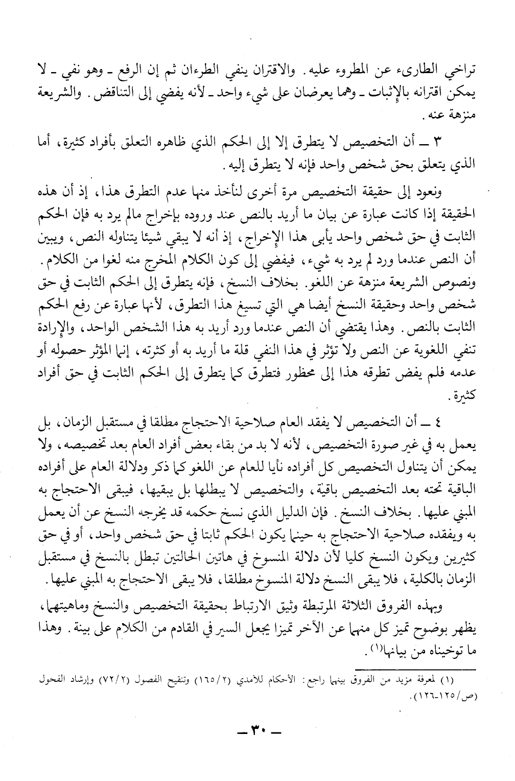 ونعود إلى حقيقة التخصيص مرة أخرى لنأخذ منها عدد التطرق هذا، إذ أن هذه الحقيقة إذا كانت عبارة عن بيان ما أريد بالنص عند وروده بإخراج ما لم يرد به فإن الحكم الثابت في حق شخص واحد يأبى هذا الإخراج، إذ أنه لا يبقي شيئا يتناوله النص، ويبين أن النص عندما ورد لم يرد به شيء، فيفضي إلى كون الكلام المخرج منه لغوا من الكلام. ونصوص الشريعة منزهة عن اللغو. بخلاف النسخ، فإنه يتطرق إلى الحكم الثابت في حق شخص واحد وحقيقة النسخ أيضا هي التي تسيغ هذا التطرق، لأنها عبارة عن رفع الحكم الثابت بالنص. وهذا يقتضي أن النص عندما ورد أريد به هذا الشخص الواحد، والإرادة تنفي اللغوية عن النص ولا تؤثر في هذا النفي قلة ما أريد به أو كثرته، إنما المؤثر حصوله أو عدمه فلم يفض تطرقه هذا إلى محظور فتطرق كما يتطرق إلى الحكم الثابت في حق أفراد كثيرة.