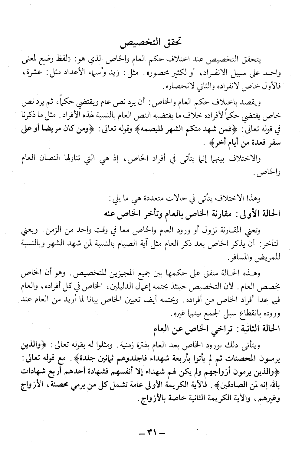 وتعني المقارنة نزول أو ورود العام والخاص معا في وقت واحد من الزمن. ويعني التأخر: أن يذكر الخاص بعد ذكر العام مثل آية الصيام بالنسبة لمن شهد الشهر وبالنسبة للمريض والمسافر.