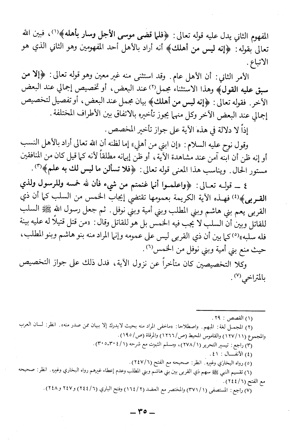 المفهوم الثاني يدل عليه قوله تعالى: {فَلَمَّا قَضَى مُوسَى الأَجَلَ وَسَارَ بِأَهْلِهِ} 1، فبين الله تعالى بقوله: {إِنَّهُ لَيْسَ مِنْ أَهْلِكَ} أنه أراد بالأهل أحد المفهومين وهو الثاني الذي هو الأتباع.