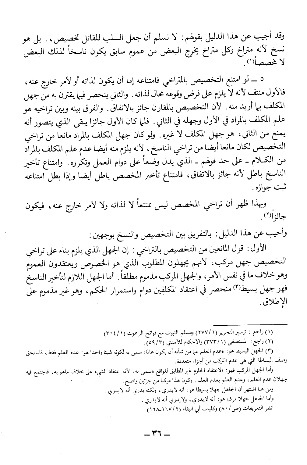 الأول: قول المانعين من التخصيص بالتراخي: إن الجهل الذي يلزم بناء على تراخي التخصيص جهل مركب، لأنهم يجهلون المطلوب الذي هو الخصوص ويعتقدون العموم وهو خلاف ما في نفس الأمر، والجهل المركب مذموم مطلقاً. أما الجهل اللازم لتأخير الناسخ فهو جهل بسيط3 منحصر في اعتقاد المكلفين دوام واستمرار الحكم، وهو غير مذموم على الإطلاق.