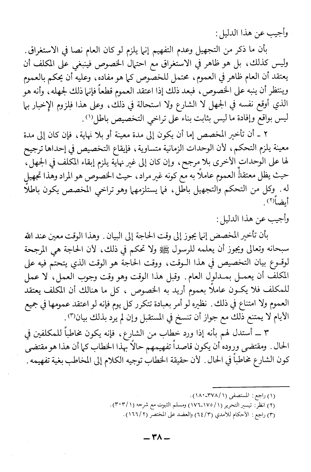 بأن تأخير المخصص إنما يجوز إلى وقت الحاجة إلى البيان. وهذا الوقت معين عند الله سبحانه وتعالى يجوز أن يعلمه للرسول صلى الله عليه وسلم ولا تحكم في ذلك، لأن الحاجة هي المرجحة لوقوع بيان التخصيص في هذا الوقت، ووقت الحاجة هو الوقت الذي يتحتم فيه على المكلف أن يعمل بمدلول العام. وقبل هذا الوقت وهو وقت وجوب العمل، لا عمل للمكلف فلا يكون عاملاً بعموم أريد به الخصوص، كل ما هنالك أن المكلف يعتقد العموم ولا امتناع في ذلك. نظيره لو أمر بعبادة تتكرر كل يوم فإنه لو اعتقد عمومها في جميع الأيام لا يمتنع ذلك مع جواز أن تنسخ هذا المستقبل وإن لم يرد بذلك بيان3.