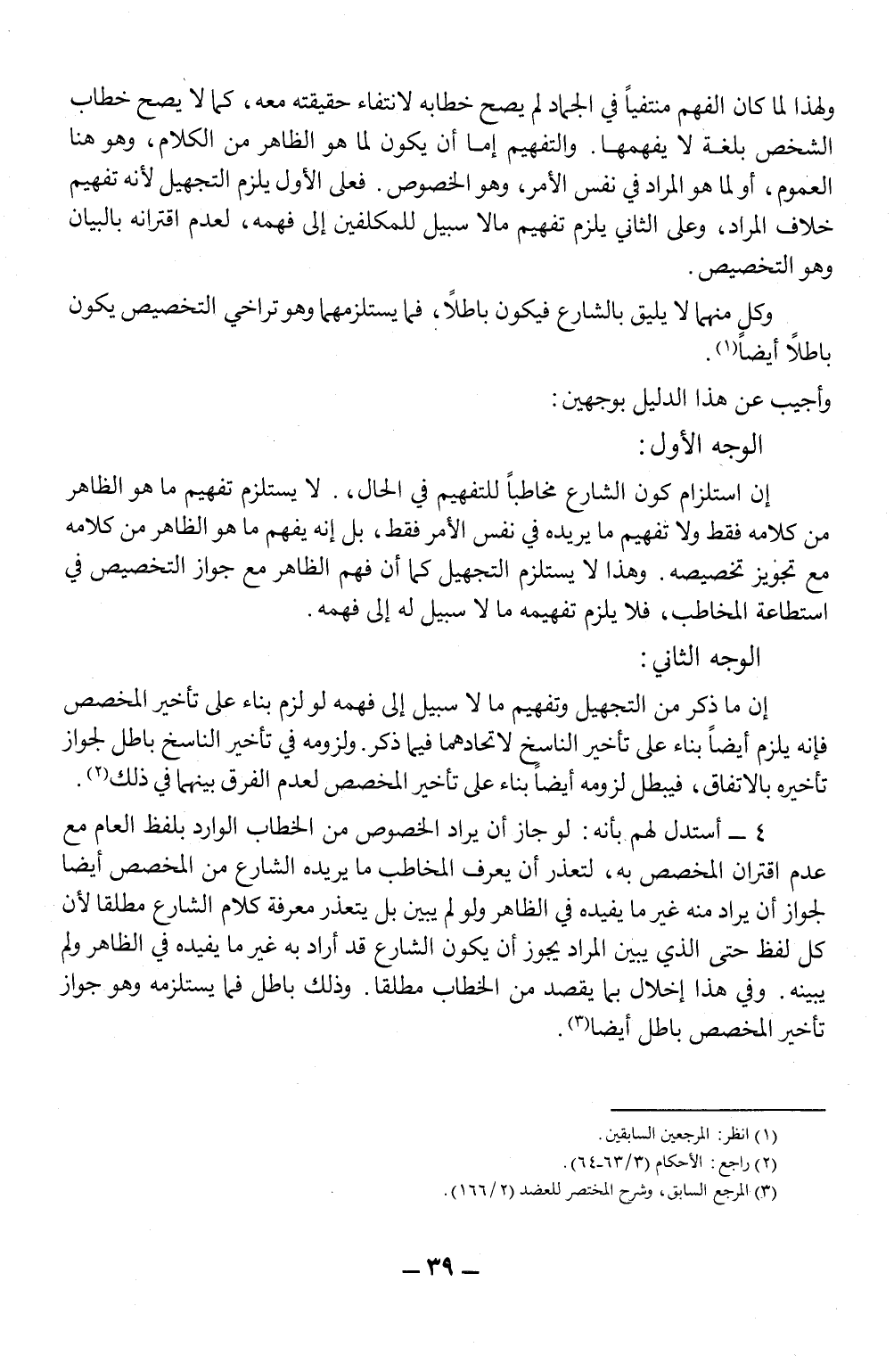 إن استلزام كون الشارع مخاطباً للتفهيم في الحال لا يستلزم تفهيم ما هو الظاهر من كلامه فقط ولا تفهيم ما يريده في نفس الأمر فقط، بل إنه يفهم ما هو الظاهر من كلامه مع تجويز تخصيصه. وهذا لا يستلزم التجهيل كما أن فهم الظاهر مع جواز التخصيص في استطاعة المخاطب، فلا يلزم تفهيمه ما لا سبيل له إلى فهمه.