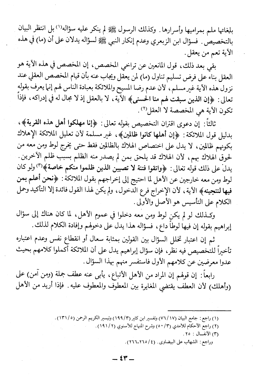 ثالثاً: إن دعوى اقتران التخصيص بقوله تعالى: {إِنَّا مُهْلِكُو أَهْلِ هَذِهِ الْقَرْيَةِ} بدليل قول الملائكة: {إِنَّ أَهْلَهَا كَانُوا ظَالِمِينَ} ، غير مسلمة لأن تعليل الملائكة الإهلاك بكونهم ظالمين، لا يدل على اختصاص الهلاك بالظالمين فقط حتى يخرج لوط ومن معه من لحوق الهلاك بهم، لأن الهلاك قد يلحق بمن لم يصدر منه الظلم بسبب ظلم الآخرين. يدل على ذلك قوله تعالى: {وَاتَّقُوا فِتْنَةً لا تُصِيبَنَّ الَّذِينَ ظَلَمُوا مِنْكُمْ خَاصَّةً} 3 ولو كان لوط ومن معه خارجين عن الأهل لما احتيج إلى إخراجهم بقول الملائكة: {نَحْنُ أَعْلَمُ بِمَنْ فِيهَا لَنُنَجِّيَنَّهُ} الآية، لأن الإِخراج فرع الدخول، ولم يكن لهذا القول فائدة إلا التأكيد وحمل الكلام على التأسيس هو الأصل والأولى.