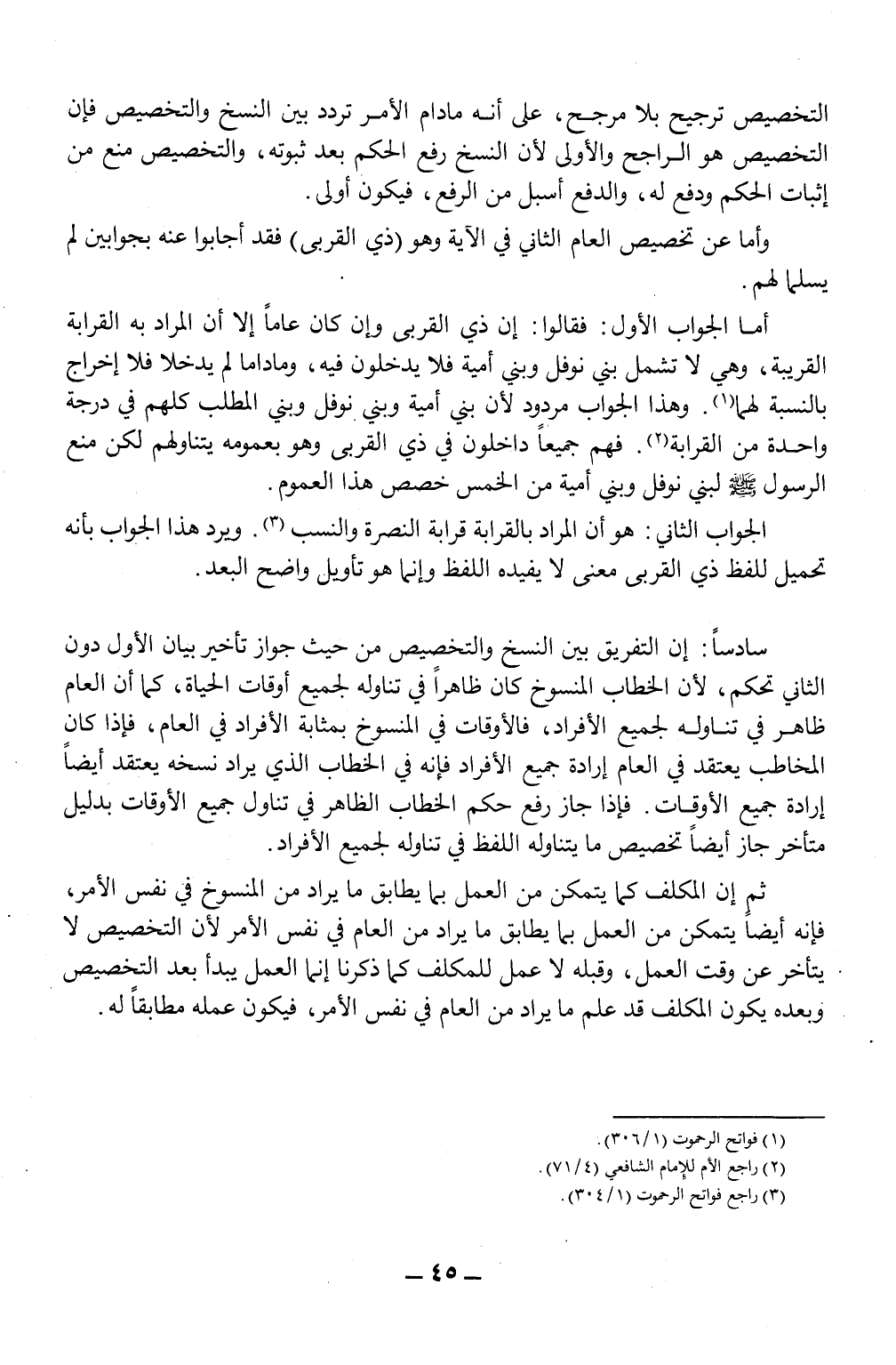 أما الجواب الأول: فقالوا: إن ذي القربى وإن كان عاماً إلا أن المراد به القرابة القريبة، وهي لا تشمل بني نوفل وبني أمية فلا يدخلون فيه، وماداما لم يدخلا فلا إخراج بالنسبة لهما1. وهذا الجواب مردود لأن بني أمية وبني نوفل وبني المطلب كلهم في درجة واحدة من القرابة2. فهم جميعاً داخلون في ذي القربى وهو بعمومه يتناولهم لكن منع الرسول صلى الله عليه وسلم لبني نوفل وبني أمية من الخمس خصص هذا العموم.