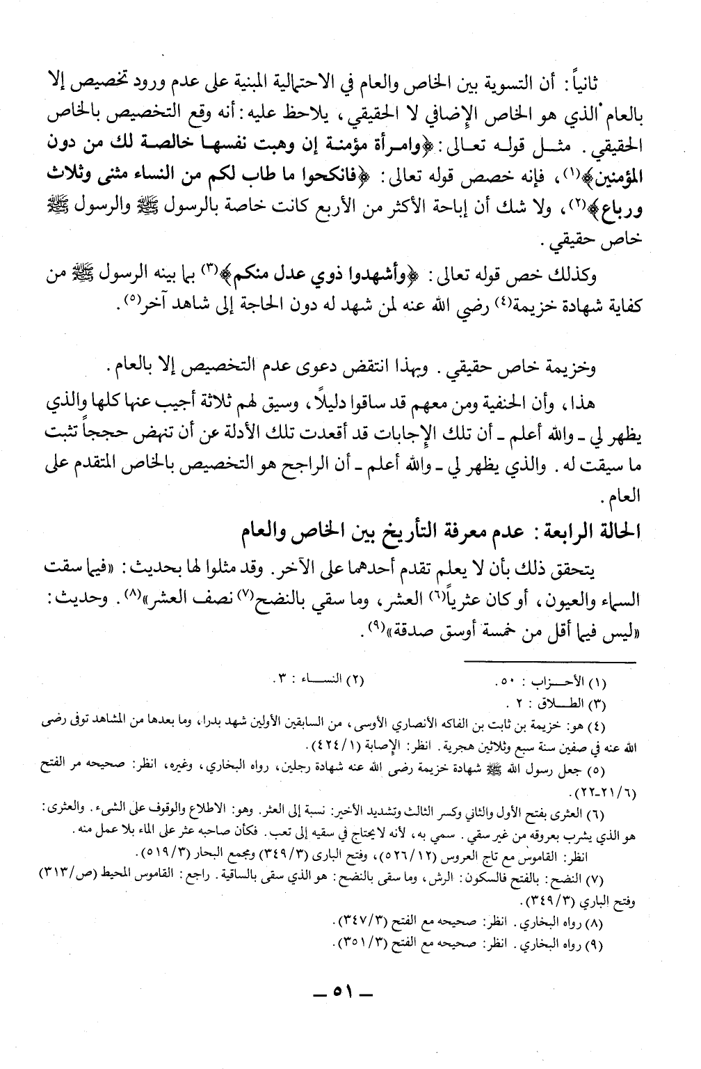 ثانياً: أن التسوية بين الخاص والعام في الاحتمالية المبنية على عدم ورود تخصيص إلا بالعام الذي هو الخاص الإضافي لا الحقيقي، يلاحظ عليه: أنه وقع التخصيص بالخاص الحقيقي. مثل قوله تعالى: {وَامْرَأَةً مُؤْمِنَةً إِنْ وَهَبَتْ نَفْسَهَا لِلنَّبِيِّ إِنْ أَرَادَ النَّبِيُّ أَنْ يَسْتَنْكِحَهَا خَالِصَةً لَكَ مِنْ دُونِ الْمُؤْمِنِينَ} 1، فإنه خصص قوله تعالى: {فَانْكِحُوا مَا طَابَ لَكُمْ مِنَ النِّسَاءِ مَثْنَى وَثُلاثَ وَرُبَاعَ} 2، ولا شك أن إباحة الأكثر من الأربع كانت خاصة بالرسول صلى الله عليه وسلم والرسول صلى الله عليه وسلم خاص حقيقي.
