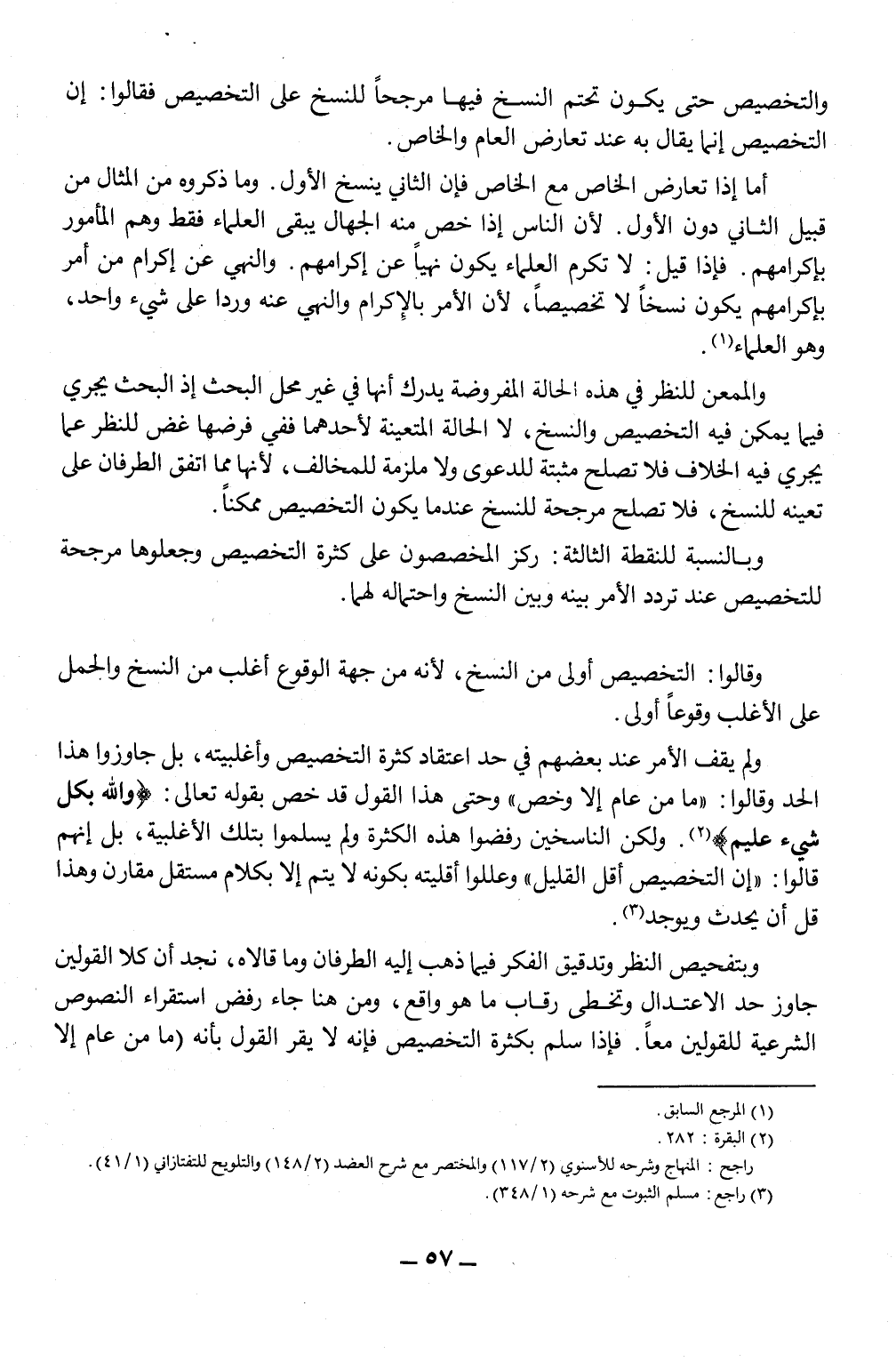ولم يقف الأمر عند بعضهم في حدِّ اعتقاد كثرة التخصيص وأغلبيته، بل جاوزوا هذا الحد وقالوا: "ما من عام إلا وخص" وحتى هذا القول قد خص بقوله تعالى: {وَاللَّهُ بِكُلِّ شَيْءٍ عَلِيمٌ} 3. ولكن الناسخين رفضوا هذه الكثرة ولم يسلموا بتلك الأغلبية، بل إنهم قالوا: "إن التخصيص أقل القليل " وعللوا أقليته بكونه لا يتم إلا بكلام مستقل مقارن وهذا قل أن يحدث ويوجد4.