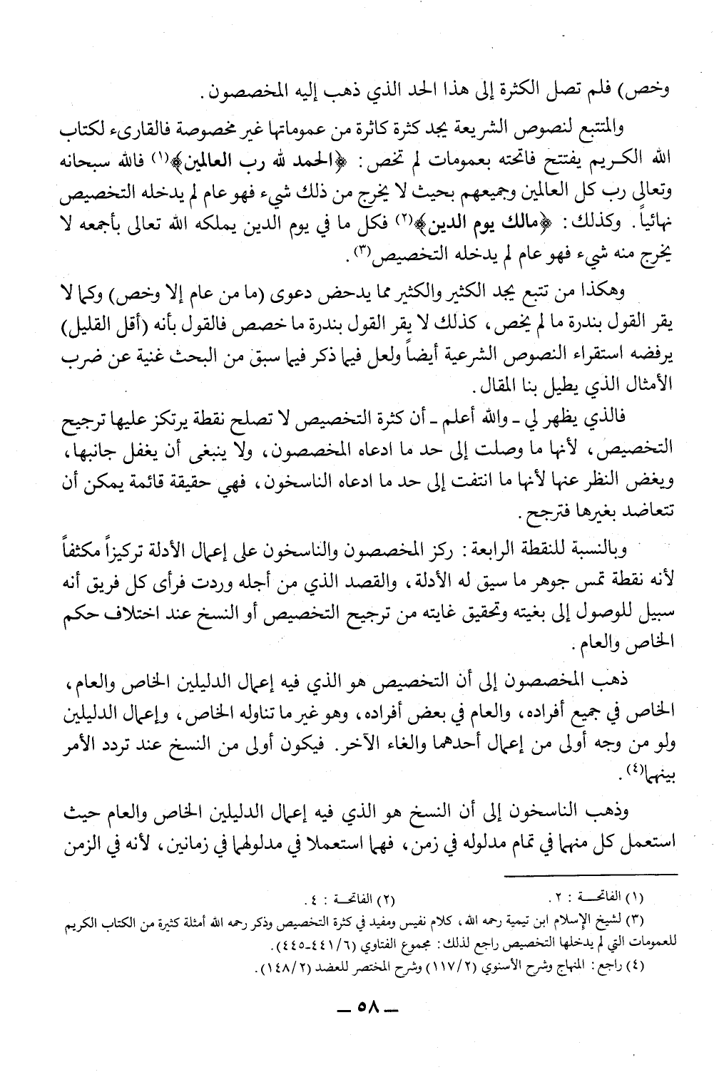 3 لشيخ الإسلام ابن تيمية رحمه الله، كلام نفيس ومفيد في كثرة التخصيص وذكر رحمه الله أمثلة كثيرة من الكتاب الكريم للعمومات التي لم يدخلها التخصيص راجع لذلك: مجموع الفتاوى (6/ 441-445) .
