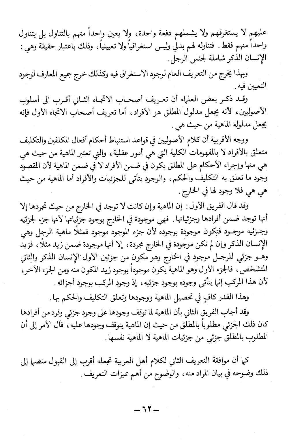 ووجه الأقربية أن كلام الأصوليين في قواعد استنباط أحكام أفعال المكلفين والتكليف متعلق بالأفراد لا بالمفهومات الكلية التي هي أمور عقلية، والتي تعتبر الماهية من حيث هي هي منها وإجراء الأحكام على المطلق يكون في ضمن الأفراد لا في ضمن الماهية لأن المقصود وجود ما تعلق به التكليف والحكم، والوجود يتأتى للجزئيات والأفراد أما الماهية من حيث هي هي فلا وجود لها في الخارج.