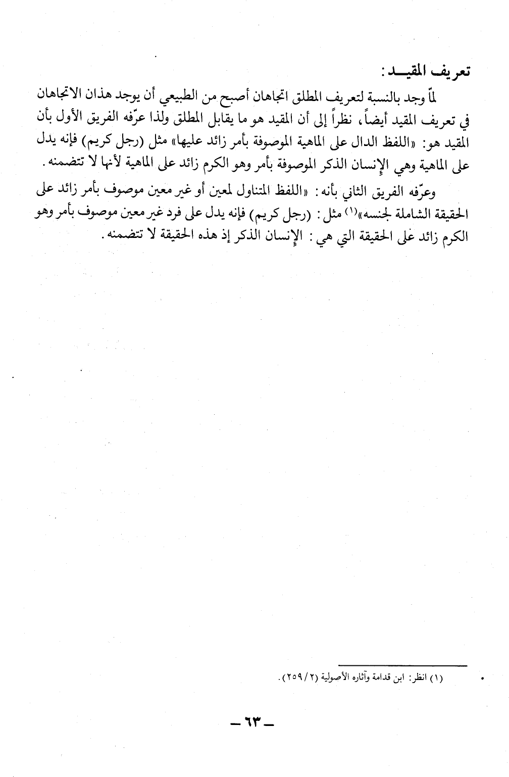 لماّ وجد بالنسبة لتعريف المطلق اتجاهان أصبح من الطبيعي أن يوجد هذان الاتجاهان في تعريف المقيد أيضاً، نظراً إلى أن المقيد هو ما يقابل المطلق ولذا عرّفه الفريق الأول بأن المقيد هو: "اللفظ الدال على الماهية الموصوفة بأمر زائد عليها" مثل (رجل كريم) فإنه يدل على الماهية وهي الإنسان الذكر الموصوفة بأمر وهو الكرم زائد على الماهية لأنها لا تتضمنه.